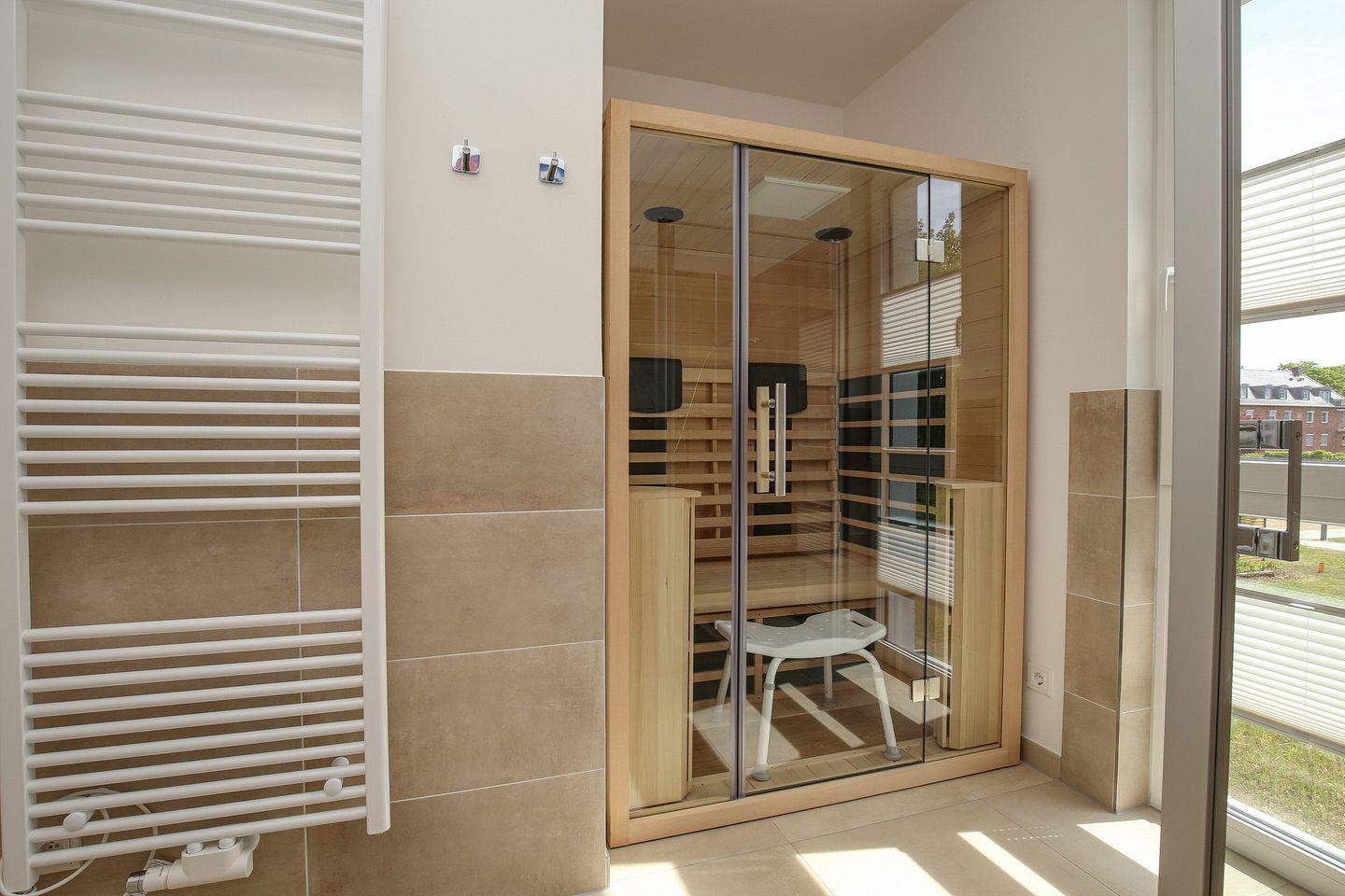 Das stilvolle Bad ist modern gefliest und mit einem Waschtisch, einer bodengleichen Dusche sowie einem WC ausgestattet. Die im Bad integrierte Infrarotsauna steht dir kostenfrei zur Verfügung.