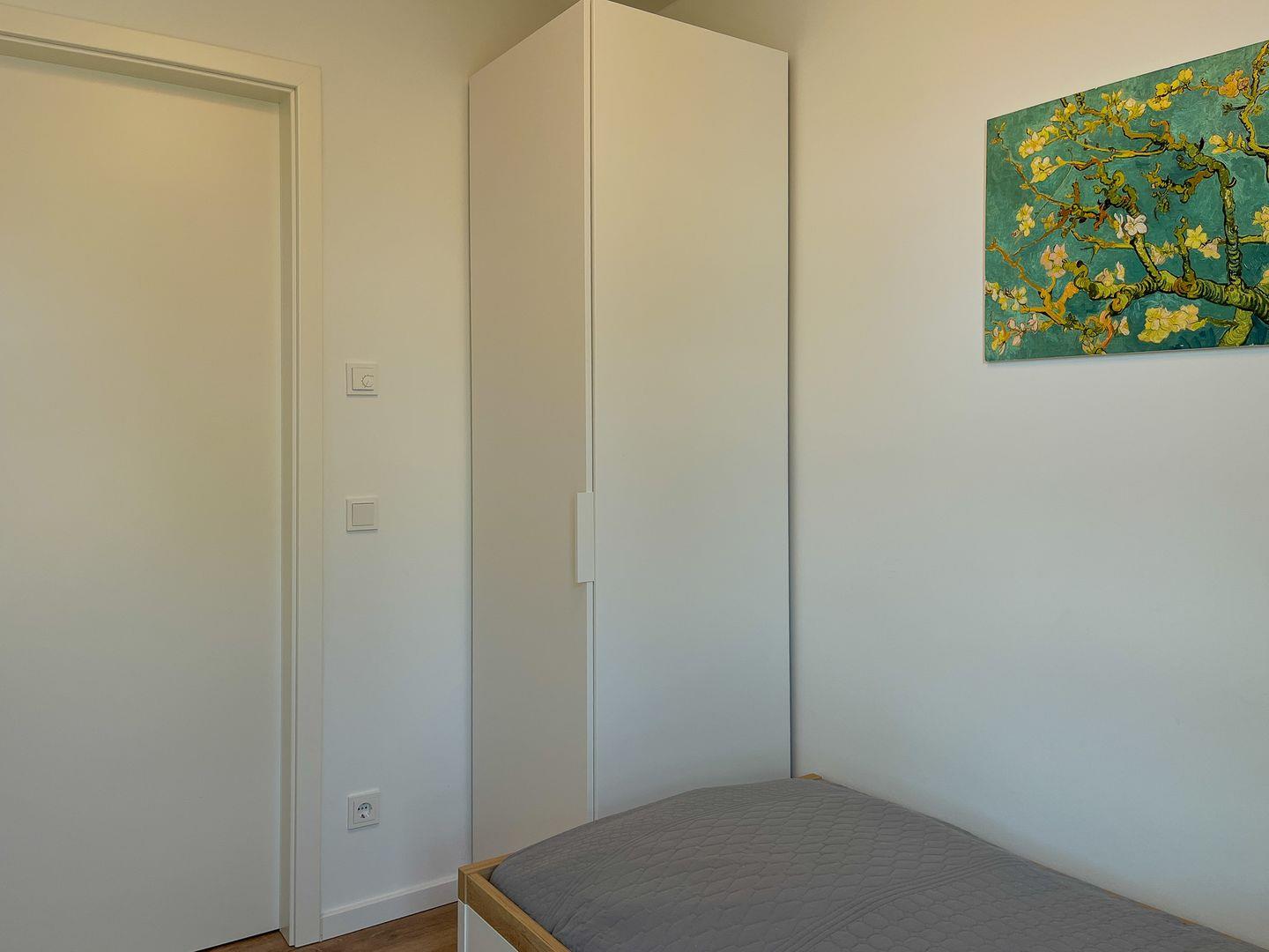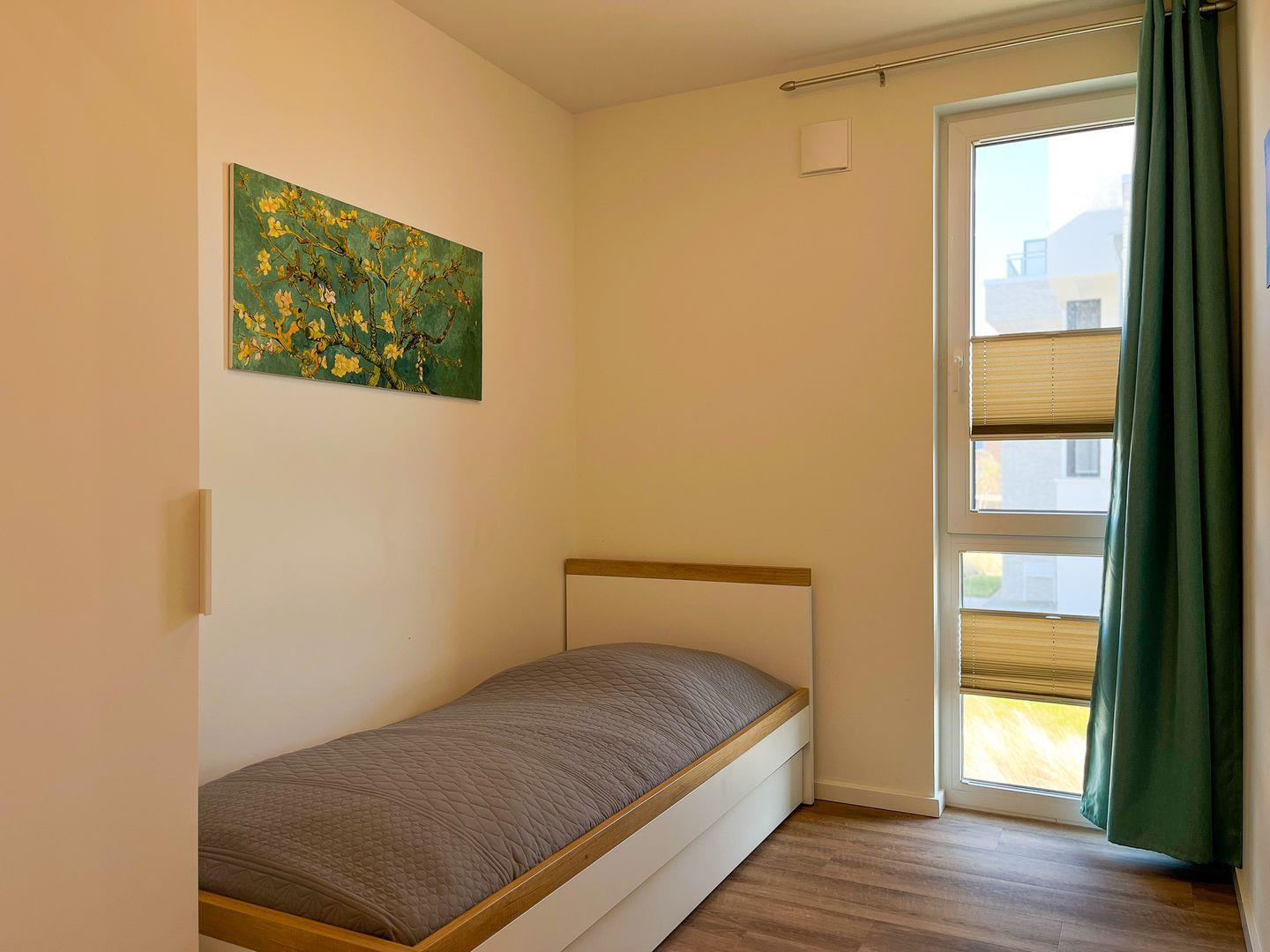Im zweiten Schlafzimmer steht ein Einzelbett mit Bettschublade (2x 90 x 200 cm) zur Verfügung. Deine Kleidung kann im Kleiderschrank untergebracht werden.