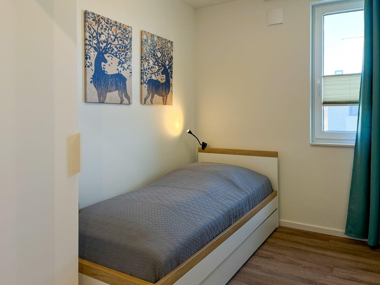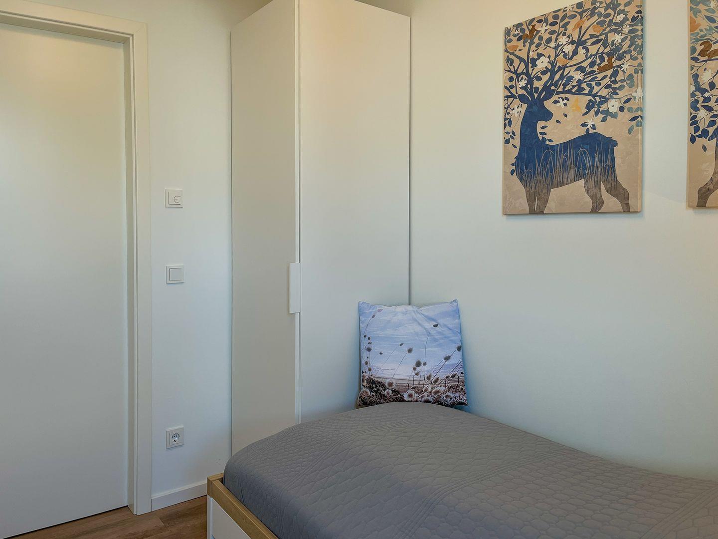 Im zweiten Schlafzimmer steht ein Einzelbett mit Bettschublade (2x 90 x 200 cm) zur Verfügung. Deine Kleidung kann ebenfalls in einem Kleiderschrank untergebracht werden.