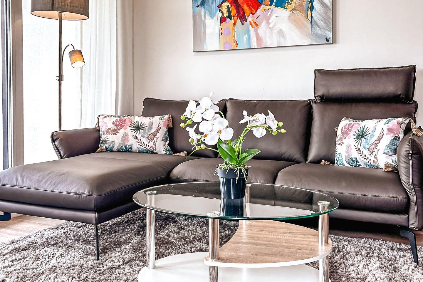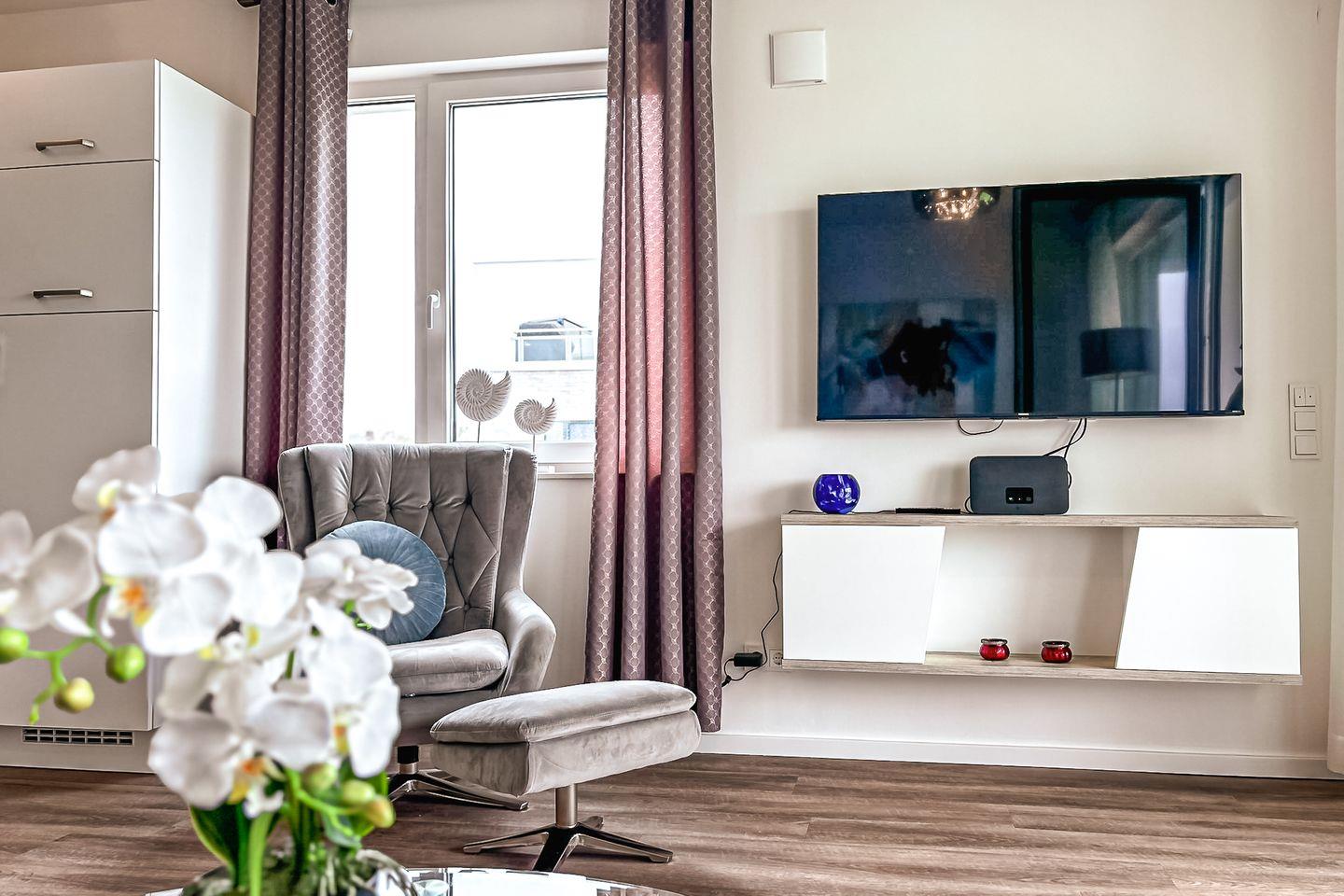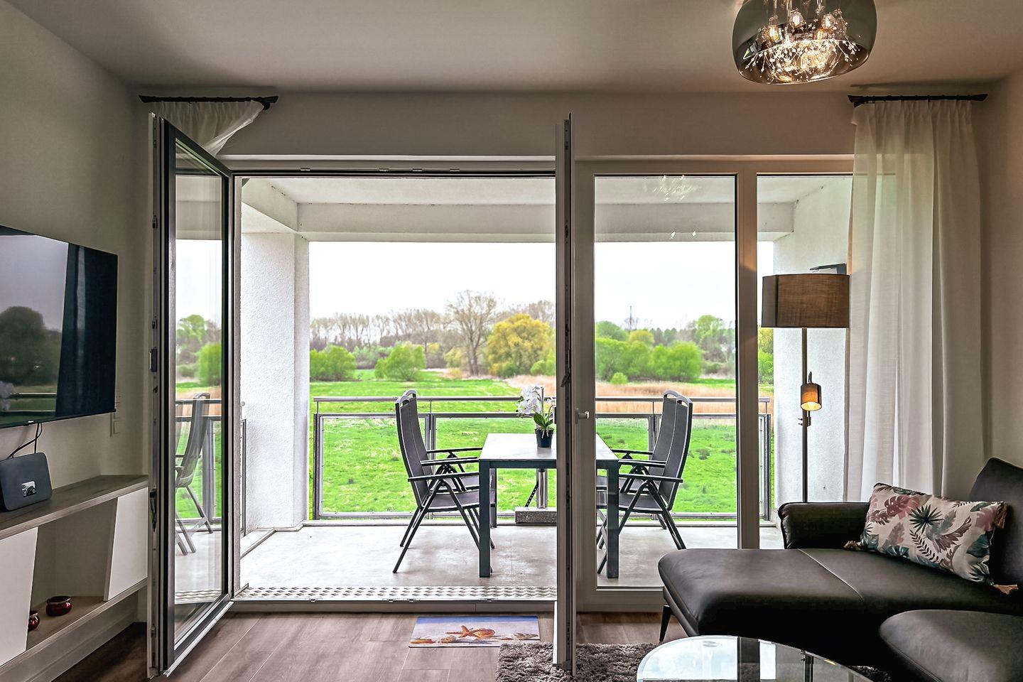 Das Wohnzimmer lädt zum Wohlfühlen und Entspannen ein. Große Fensterfronten bieten dir ein großzügiges Wohngefühl. Neben der Standardausstattung des Wohnzimmers, wie zum Beispiel einer gemütlichen Couch ist selbstverständlich ein Flachbildfernseher vorhanden. Vom Wohnzimmer aus gelangst du auf den möblierten Balkon, der nach Süden ausgerichtet ist.
