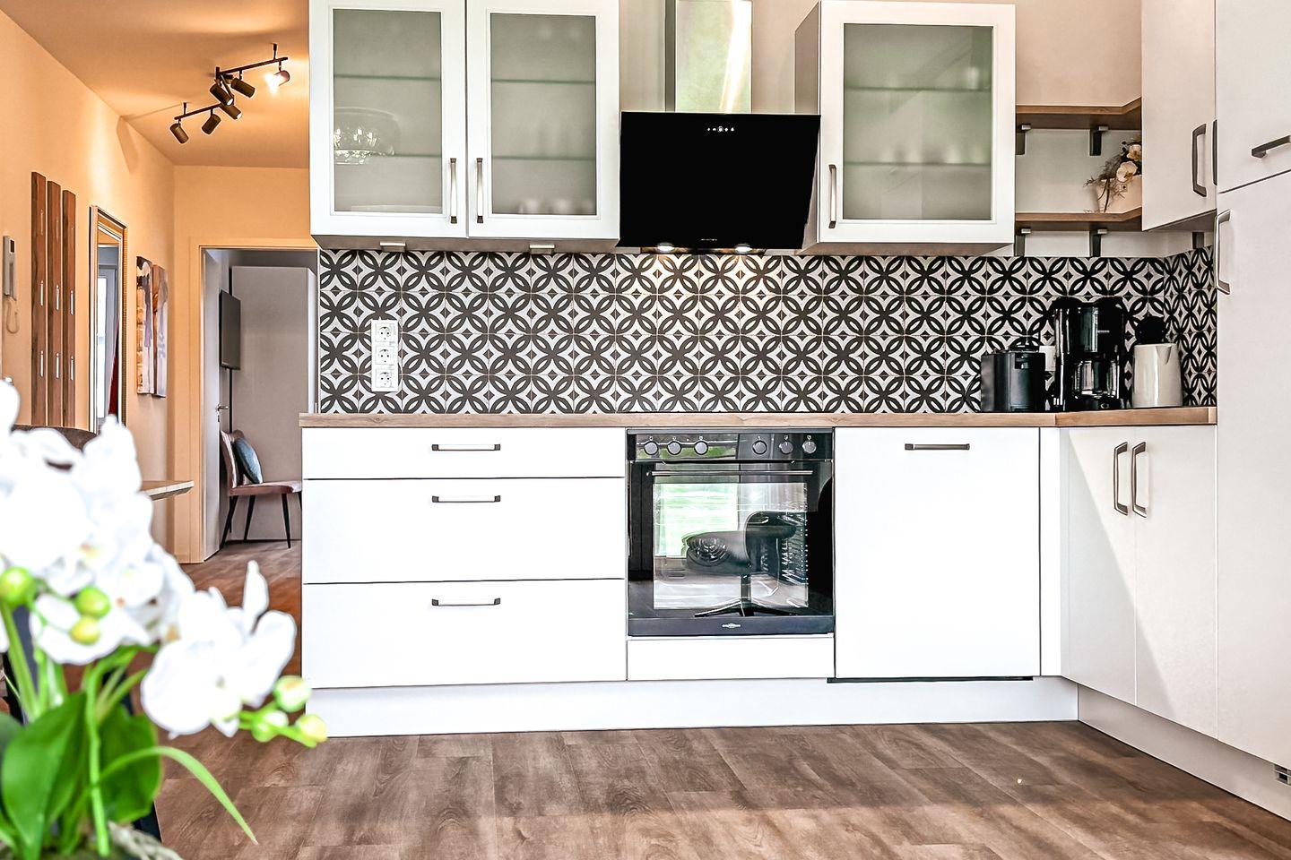 In der im Wohnzimmer integrierten Küche ist alles vorhanden, was du zur Zubereitung der Mahlzeiten benötigst. Dazu zählen ein Herd mit einem 4-Platten-Cerankochfeld sowie ein Backofen, ein Kühlschrank mit Gefrierfach, eine Geschirrspülmaschine sowie ausreichend Geschirr, Besteck und Gläser.