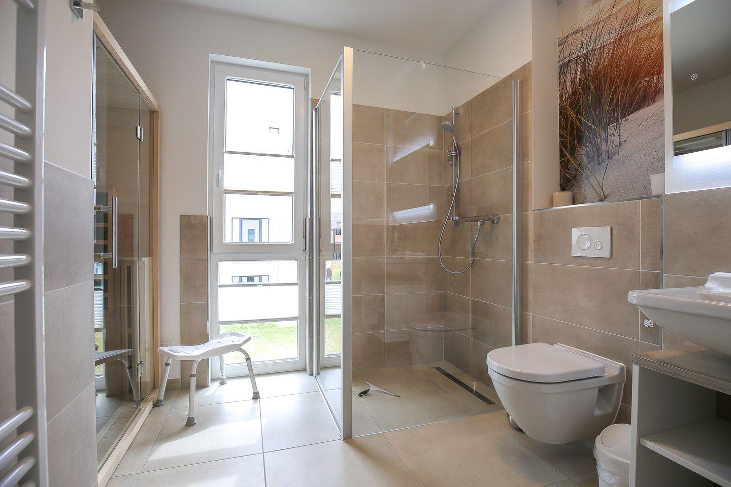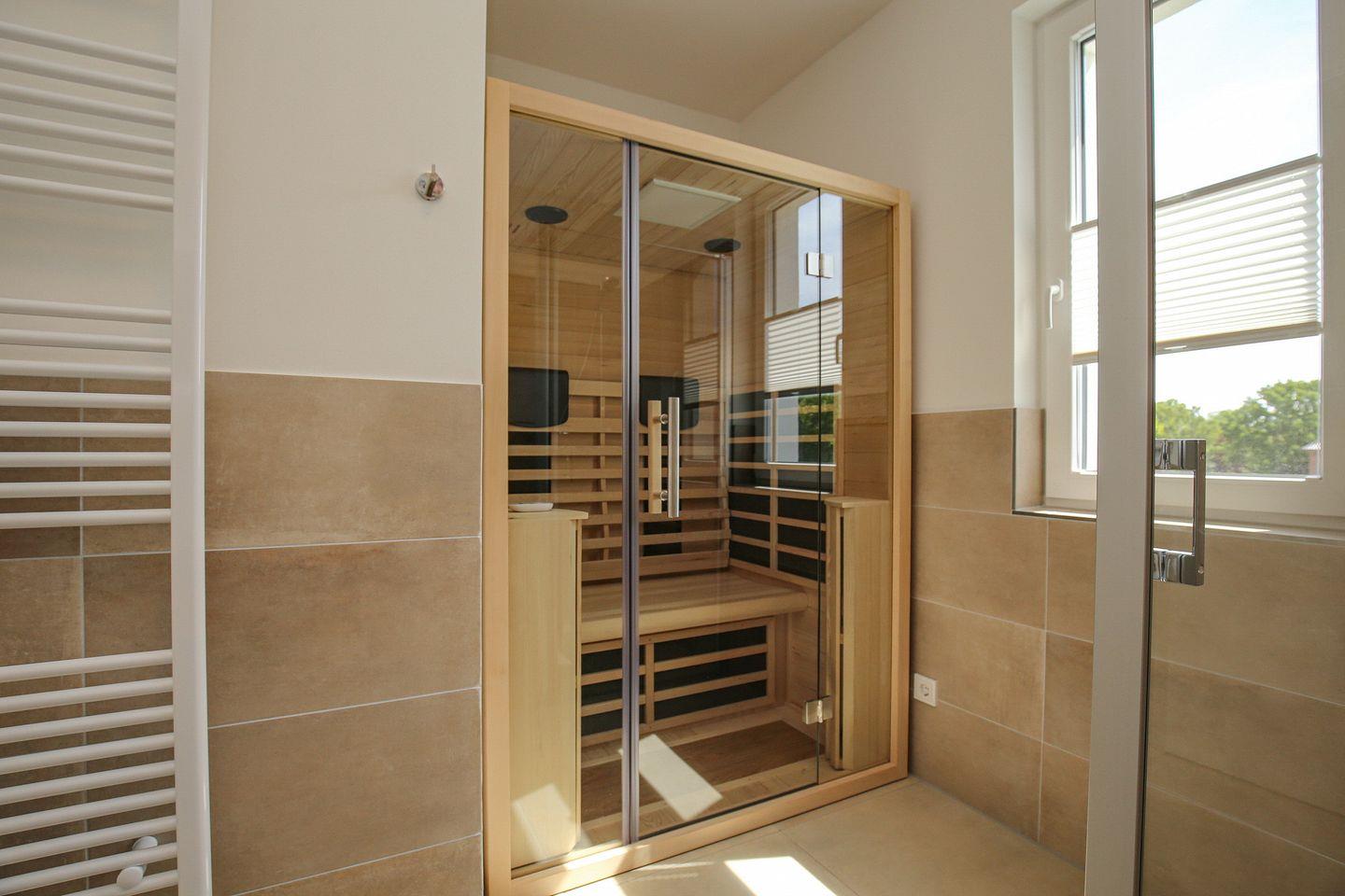 Das moderne Bad ist gefliest und mit einem Waschtisch, einer bodengleichen Dusche, einem WC sowie einem Handtuchheizkörper ausgestattet. Die im Bad integrierte Infrarotsauna steht dir kostenfrei zur Verfügung.