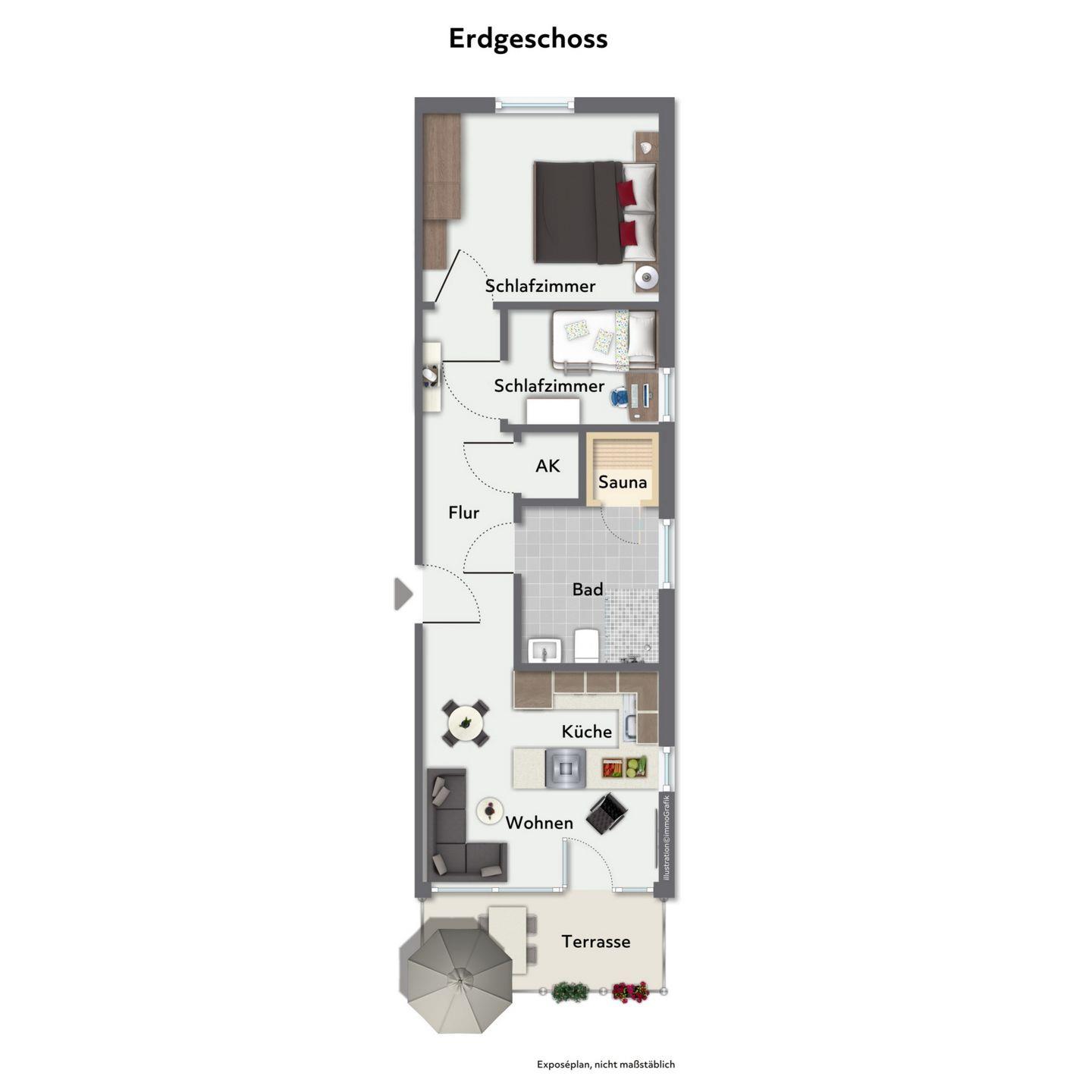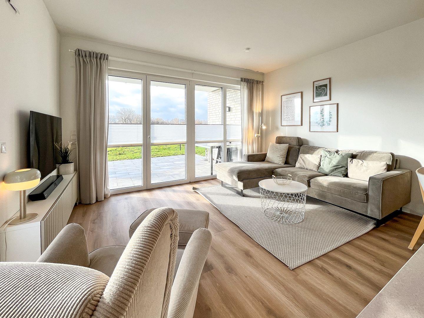 Zum Wohlfühlen und Entspannen lädt das Wohnzimmer ein. Zudem bieten dir die großen Fensterfronten ein großzügiges Wohngefühl. Neben der Standardausstattung des Wohnzimmers, wie zum Beispiel einer gemütlichen Couch, ist selbstverständlich ein Flachbildfernseher vorhanden. Vom Wohnzimmer aus gelangst du auf die möblierte Terrasse, die nach Süd/Westen ausgerichtet ist.