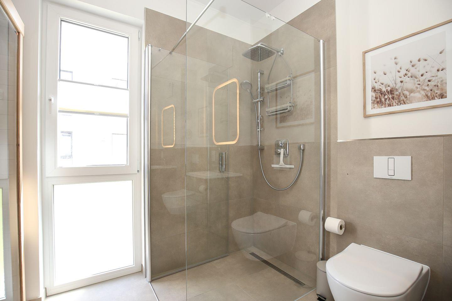 Das moderne Bad ist gefliest und mit einem Waschtisch, einer bodengleichen Dusche, einem WC sowie einem Handtuchheizkörper ausgestattet. Die im Bad integrierte Infrarotsauna steht dir kostenfrei zur Verfügung.