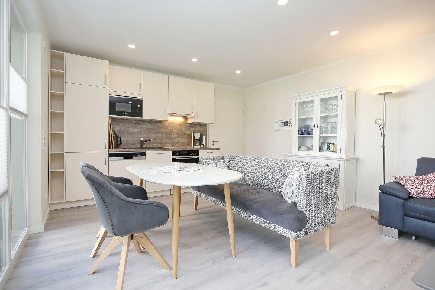Die Ferienwohnung "Sandbank" Nummer 14 im Haus 2 der Weißen Villen ist eine 3-Zimmer-Ferienwohnung im Erdgeschoss für maximal 4 Personen.