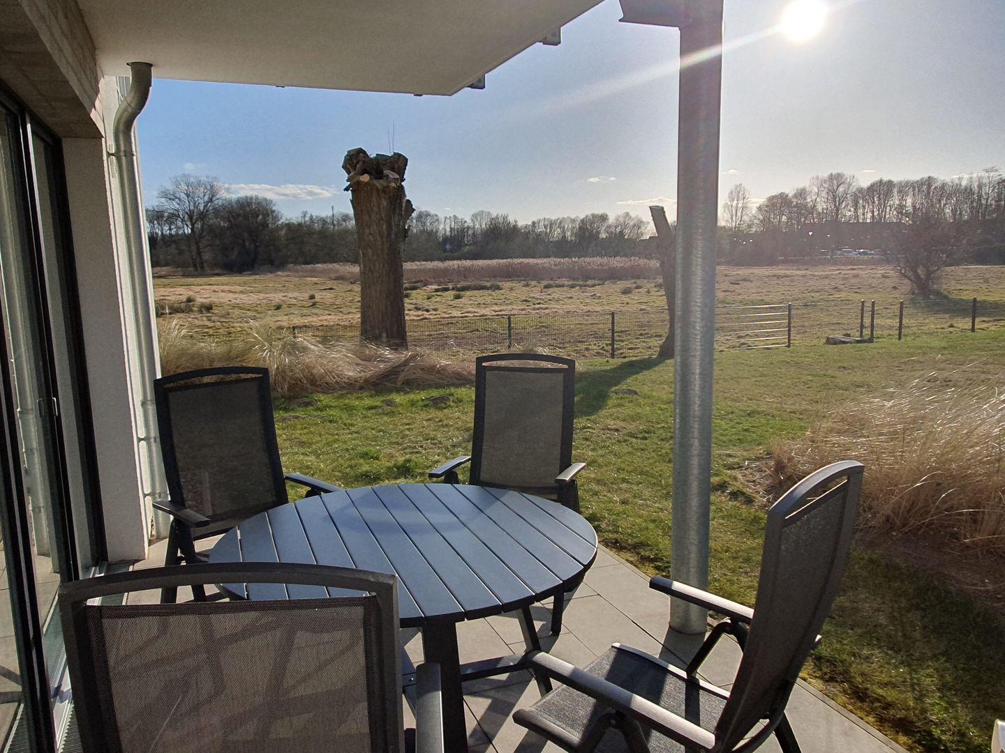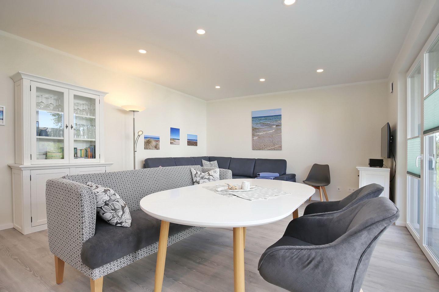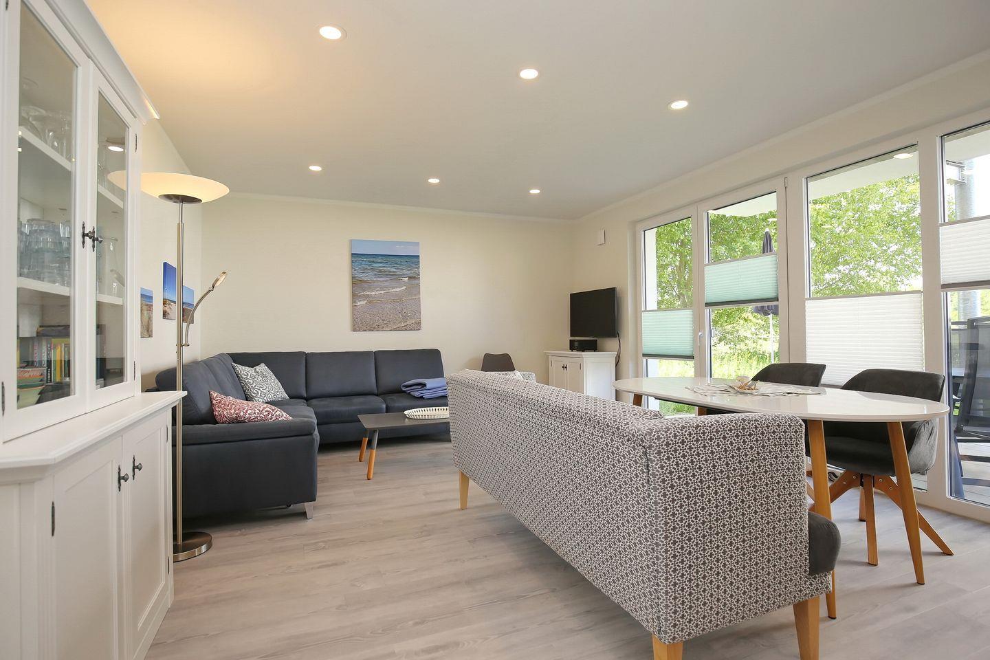 Zum Wohlfühlen und Entspannen lädt das Wohnzimmer ein. Zudem bieten dir die großen Fensterfronten ein großzügiges Wohngefühl. Neben der Standardausstattung des Wohnzimmers, wie zum Beispiel einer gemütlichen Couch, ist selbstverständlich ein Flachbildfernseher (Magenta TV) vorhanden. Die Musikanlage kann per Bluetooth mit dem Handy verbunden werden, so kannst du auch im Urlaub deine eigene Musik abspielen. Vom Wohnzimmer aus gelangst du auf die möblierte Terrasse, welche nach Süd/Westen ausgerichtet ist. Zum Relaxen steht dir auch ein Strandkorb (mit feststellbaren Rollen) zur Verfügung. Die Bäume neben der Terrasse wurden im Frühjahr 2025 auf den Stamm gekürzt, so dass nun noch mehr Sonne genossen werden kann.