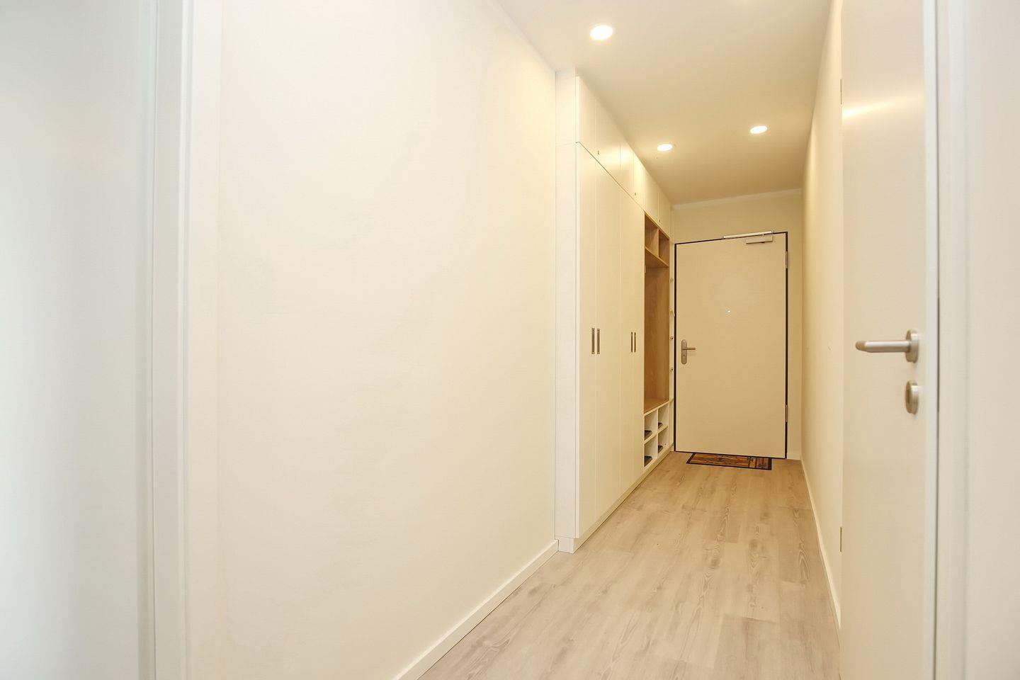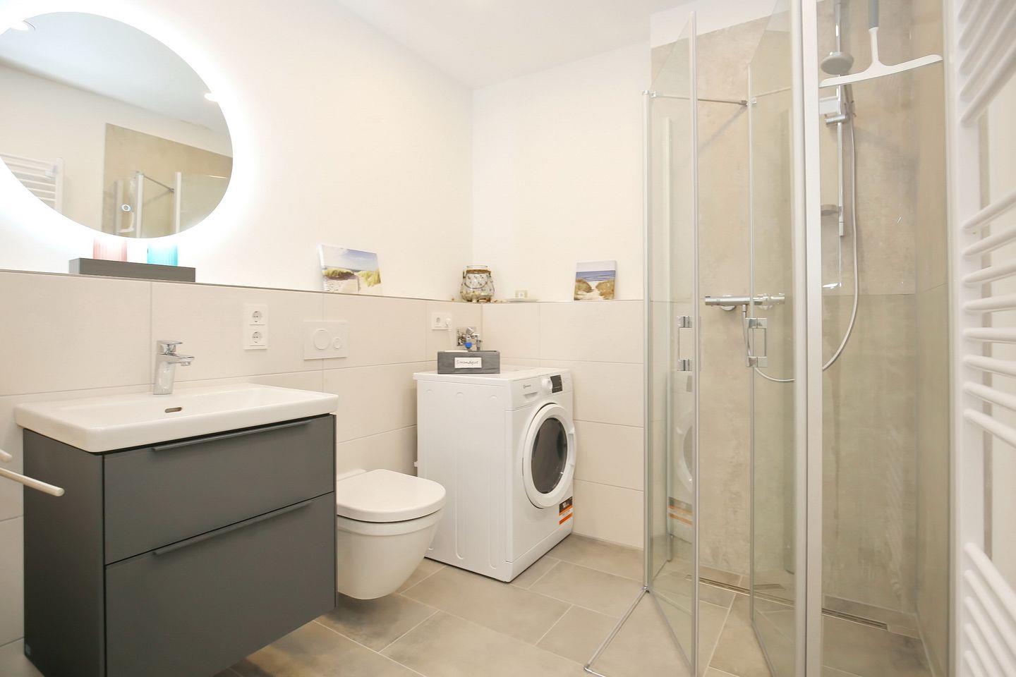 Das moderne Bad ist gefliest und mit einem Waschtisch, einer bodengleichen Dusche, einem WC sowie einem Handtuchheizkörper ausgestattet. Weiterhin steht dir ein Waschtrockner zur Verfügung.
