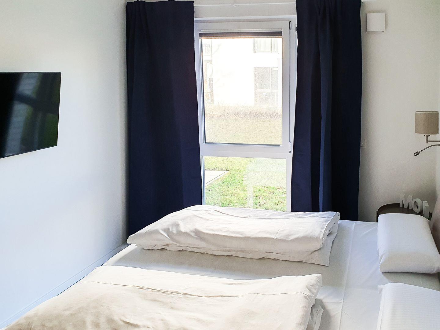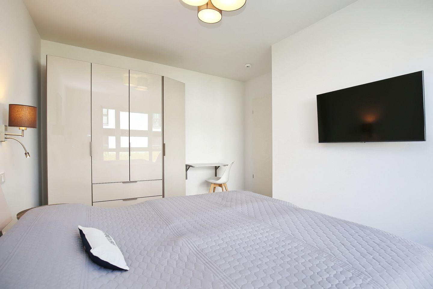 Das erste Schlafzimmer verfügt über ein komfortables Doppelbett (2 x 90x200 cm). Im großen Kleiderschrank kannst du deine Kleidung aufbewahren. Zudem steht dir hier ein 2. TV zur Verfügung.