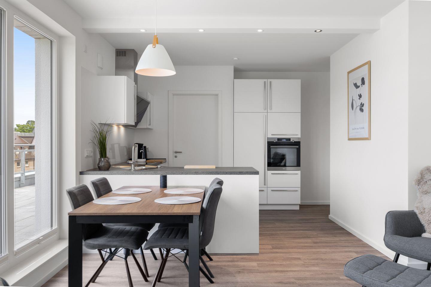 Das hochwertige und barrierearm konzipierte Nichtraucher-Apartment verfügt über Fußbodenheizung, bodentiefe Fenster, kostenfreies WLAN und eine hochwertige und voll ausgestattete offene Küche mit 4-Felder-Ceranherd, Backofen, Mikrowelle, Geschirrspüler, Kühlschrank mit Gefrierfach, Kaffeefilter- und Kaffeepad Maschine, Toaster, Wasserkocher und Eierkocher.