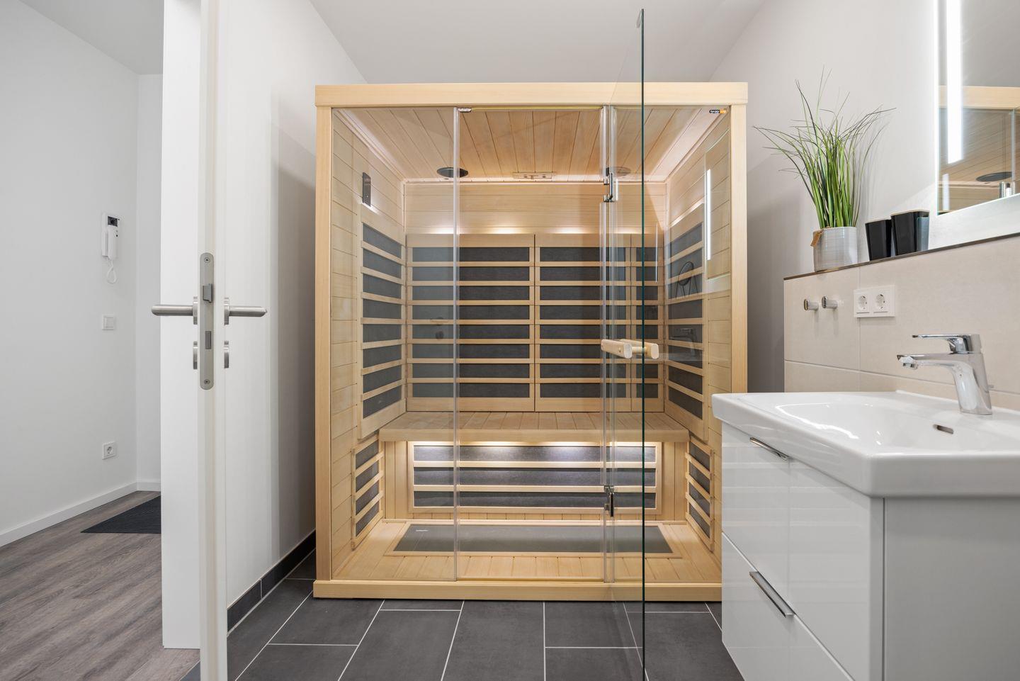Beide stilvollen Badezimmer beinhalten jeweils eine ebenerdige Dusche, Waschtisch, Föhn und Handtuchheizkörper. Ein weiteres Highlight des Apartments: Im größeren Badezimmer steht euch eine Infrarotkabine zur Verfügung! Hier lässt sich wundervoll entspannen. Das Apartment verfügt über eine Waschmaschine - ideal für Familien oder den längeren Aufenthalt.