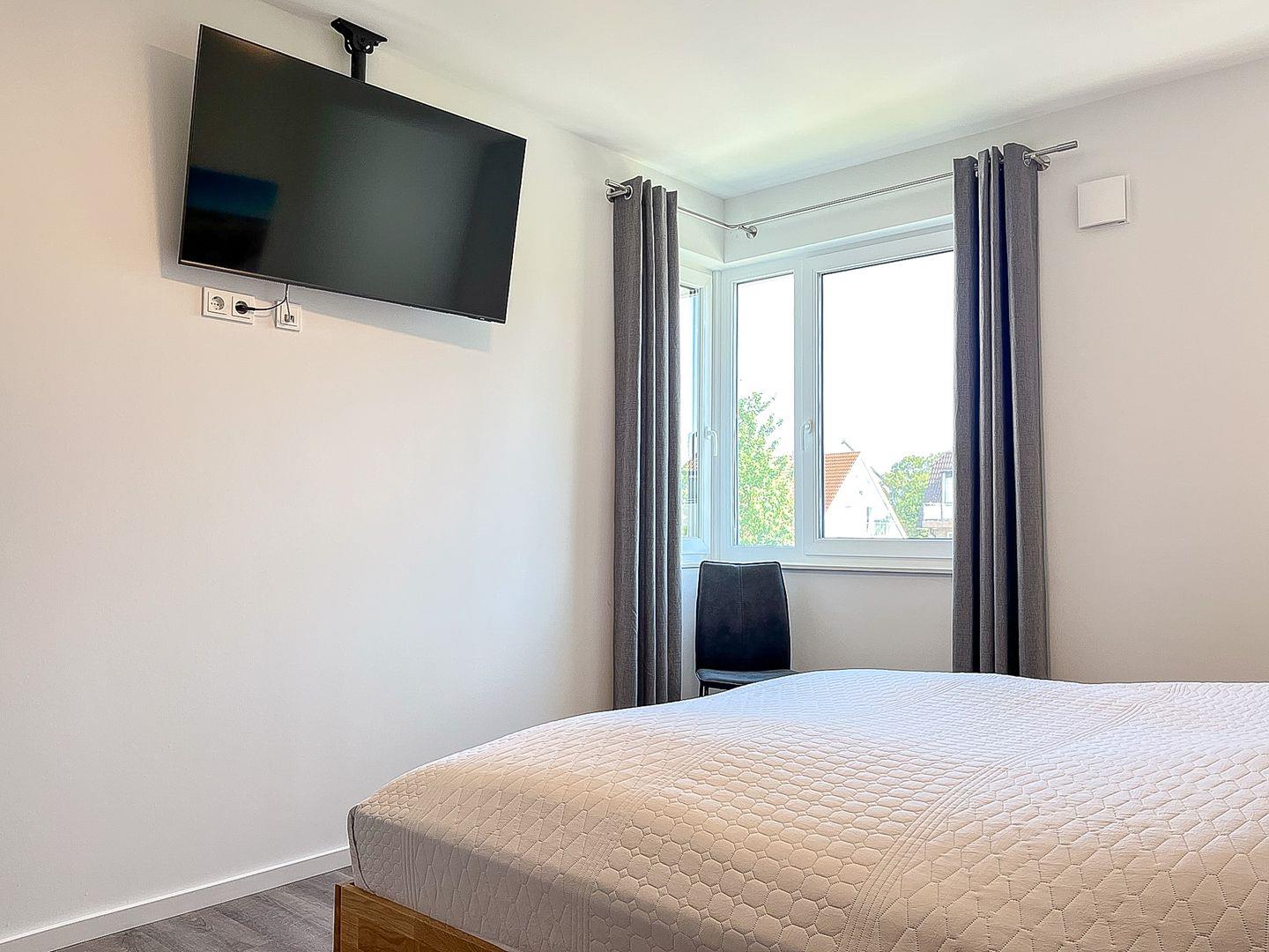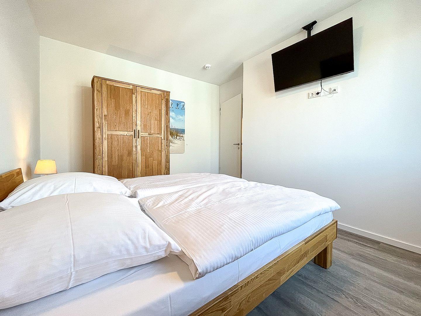 Auch das zweite Schlafzimmer verfügt über ein Doppelbett (2x90x200 cm) sowie einen Kleiderschrank zur Aufbewahrung deiner Urlaubskleidung. Zusätzlich findest du auch hier einen Fernseher vor.