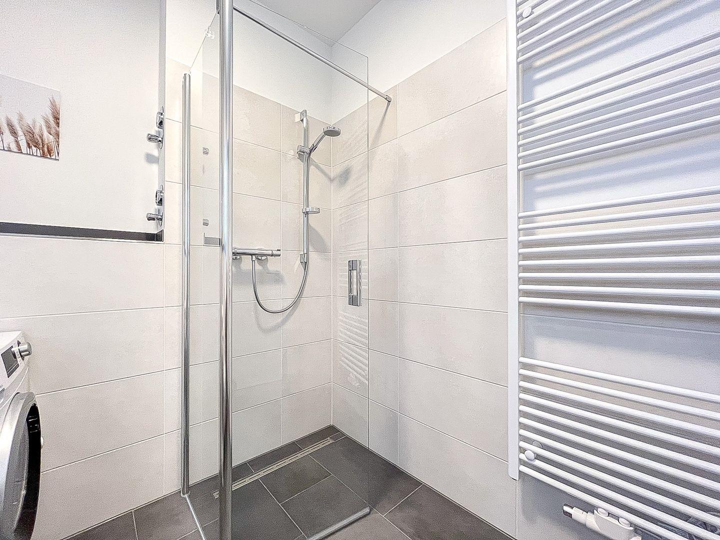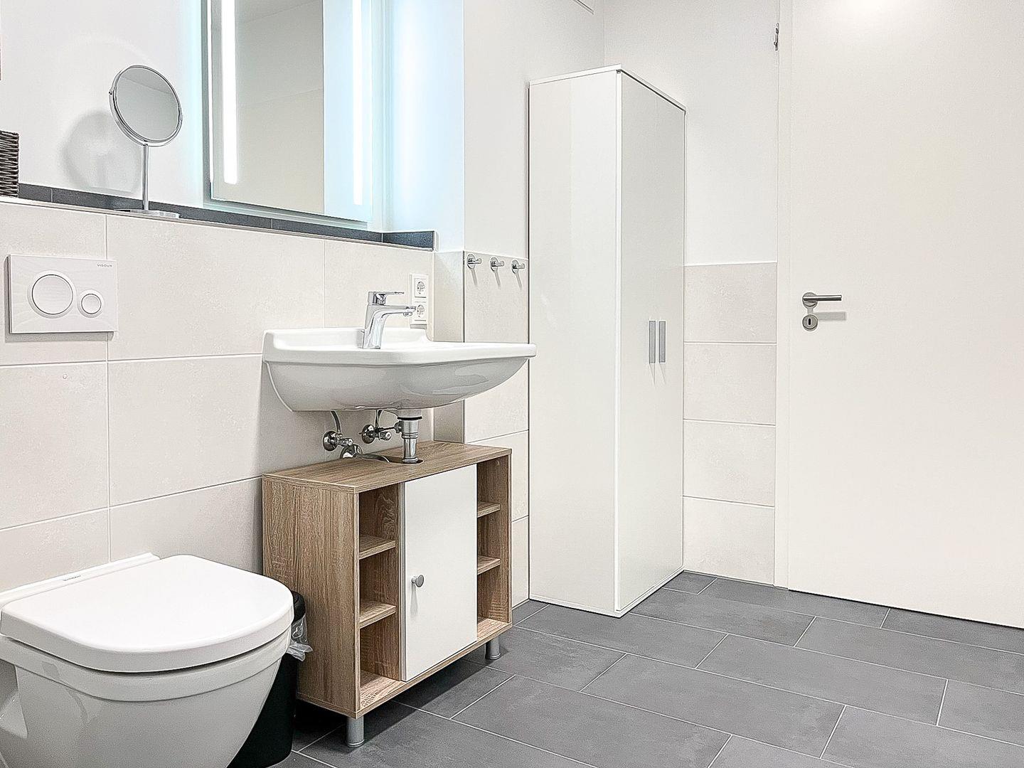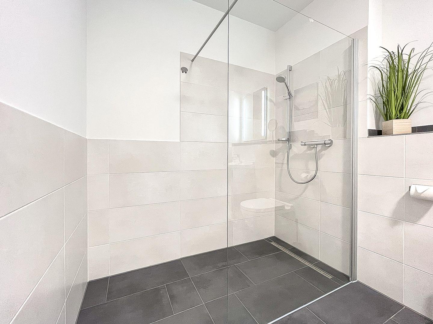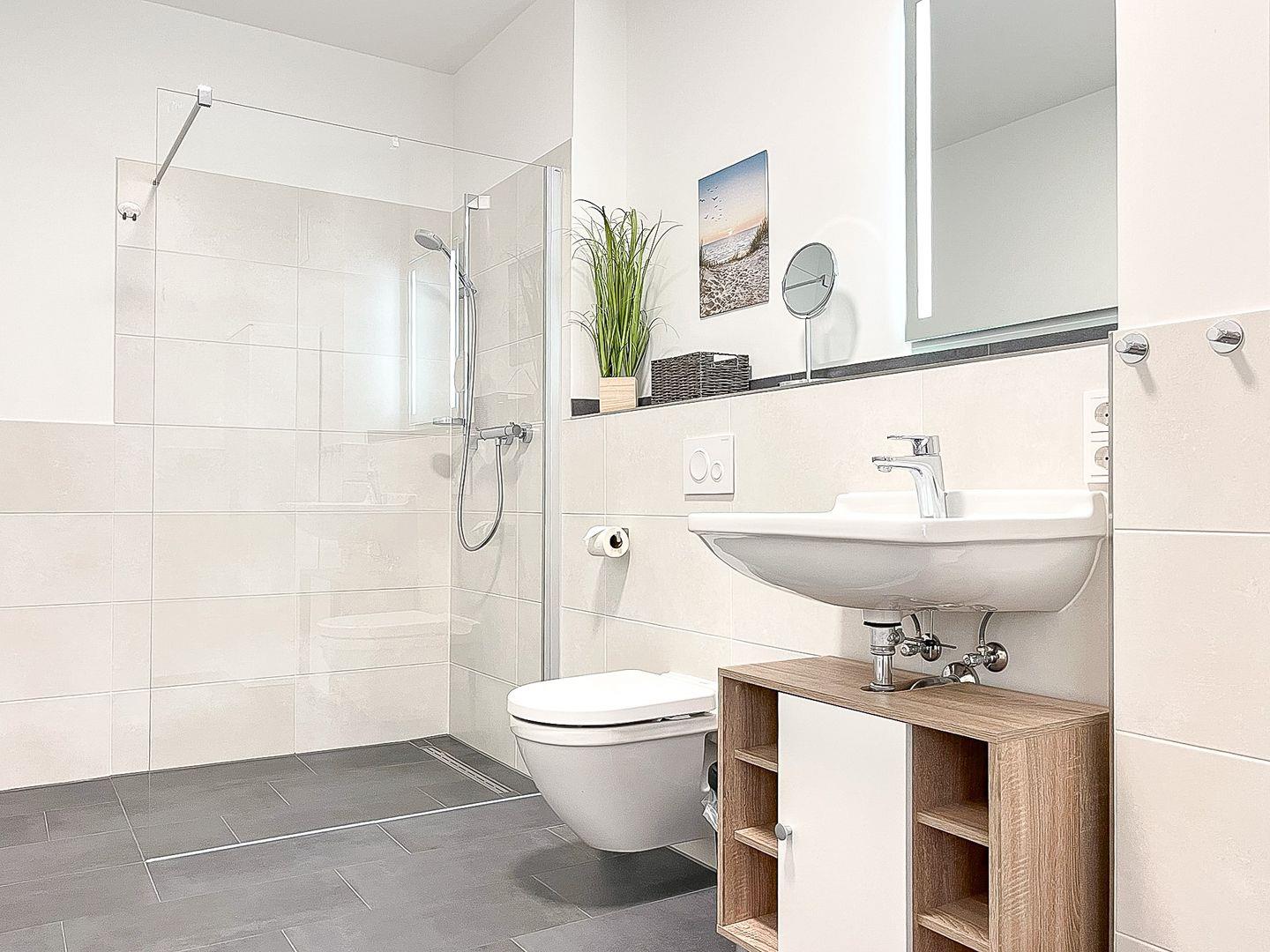 Das stilvolle Bad ist modern gefliest und mit einem Waschtisch, einer bodengleichen Dusche sowie einem WC ausgestattet. Das Gäste-WC, welches über eine Dusche verfügt, wurde ebenfalls gefliest.