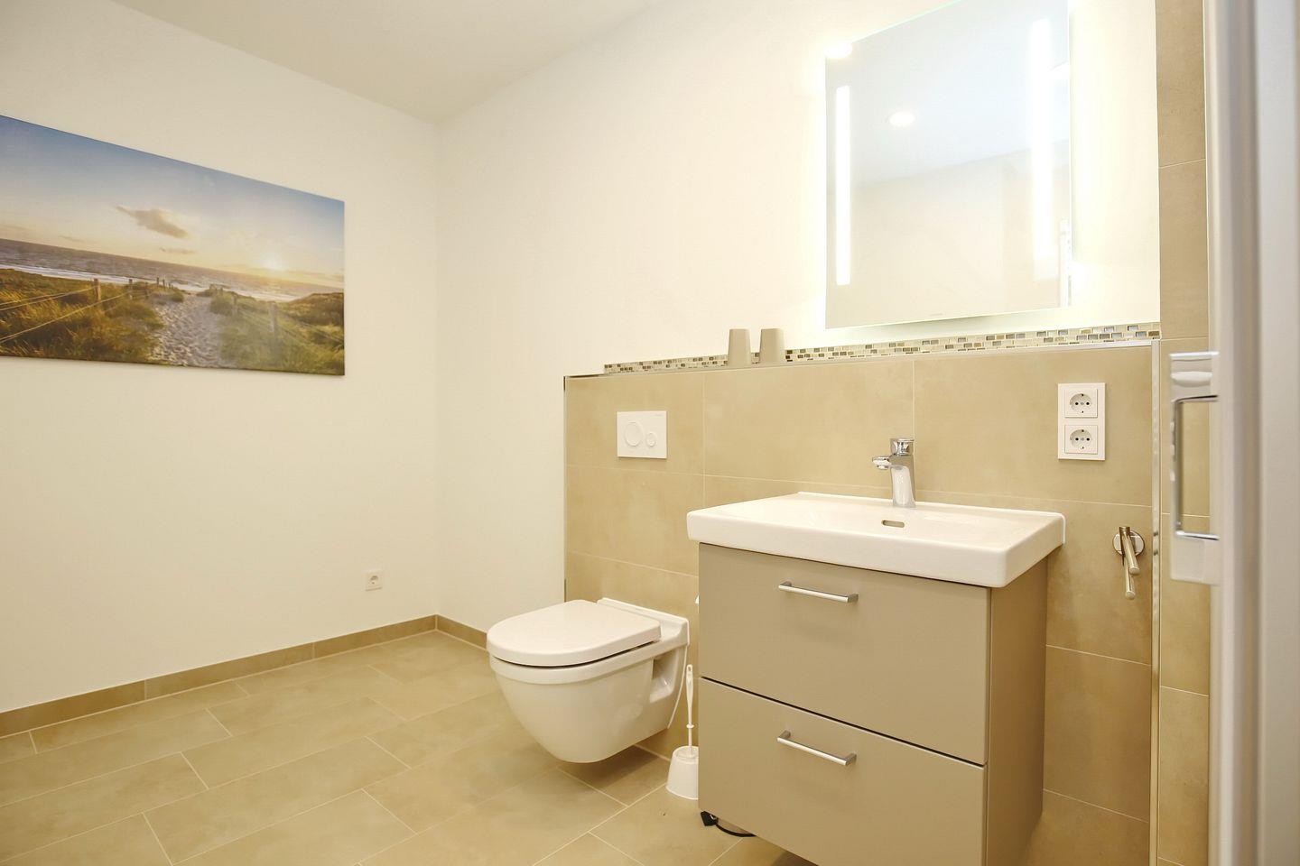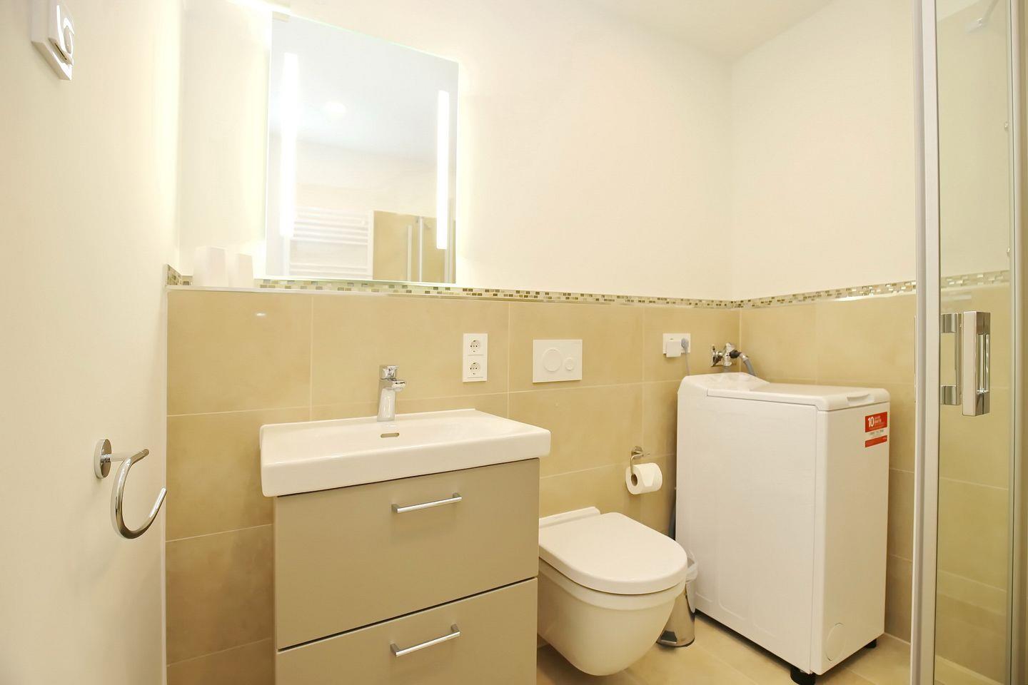 Die stilvollen Bäder sind modern gefliest und beide mit einem Waschtisch, einer bodengleichen Dusche sowie einem WC ausgestattet. Eine Waschmaschine zur Eigennutzung steht bereit.