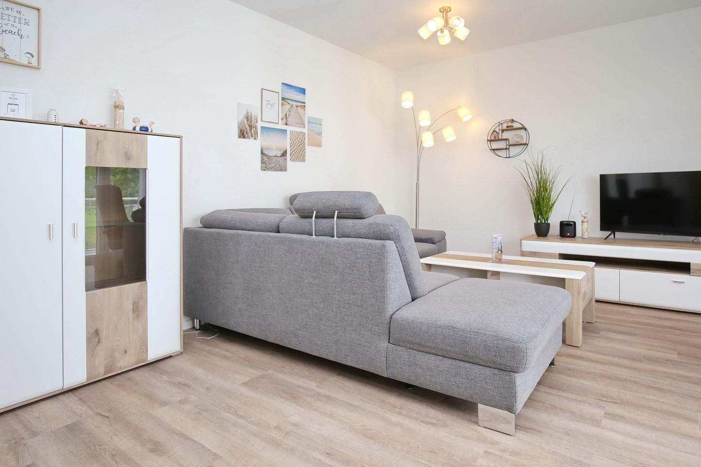 Deine ca. 87 m² große Ferienwohnung ist liebevoll und modern eingerichtet. Du verfügst über ein Wohnzimmer, eine Küche, drei Schlafzimmer, zwei Badezimmer sowie einen Balkon. In der gesamten Wohnung ist ein Vinylbelag ausgelegt. Die Badezimmer sind gefliest. Die Strandentfernung beträgt ca. 200 Meter.