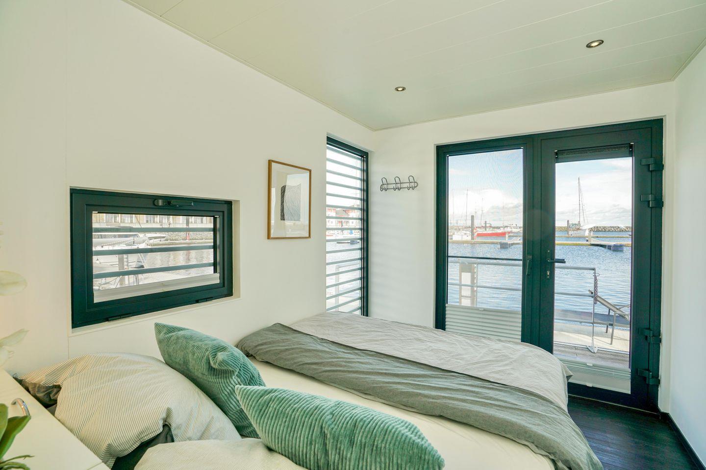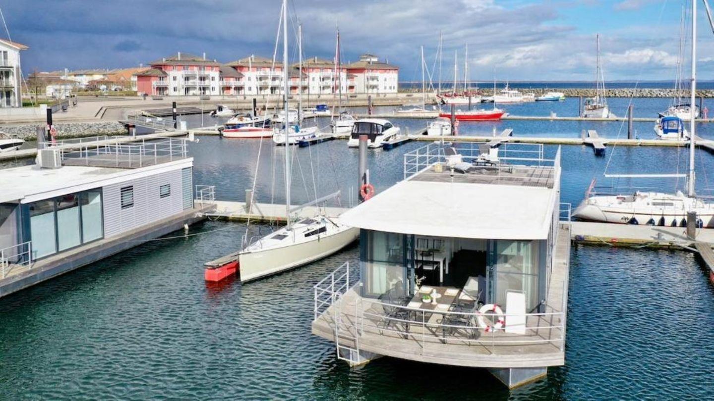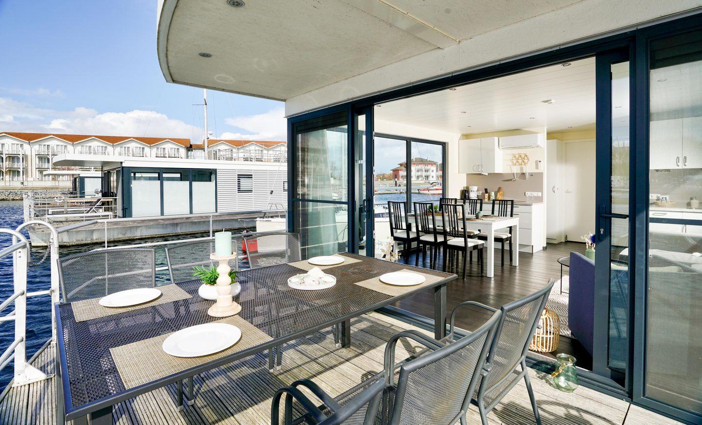 Erleben Sie das moderne, festliegende Hausboot FLOATING 44 in Boltenhagen mit zwei Terrassen und direktem Wasserzugang.