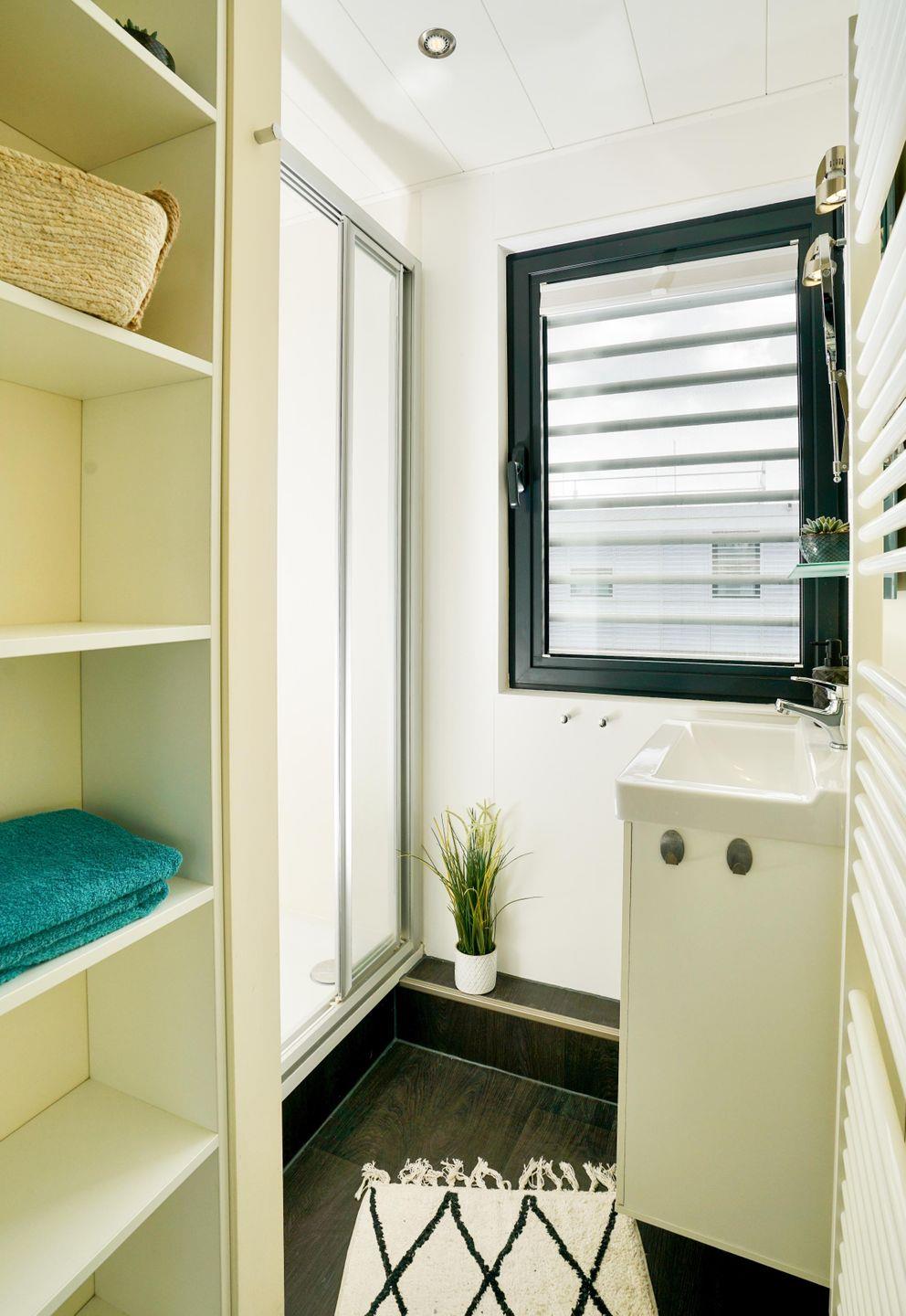 Das Bad mit Dusche und ein WC mit Waschbecken sind jeweils separat angeordnet.