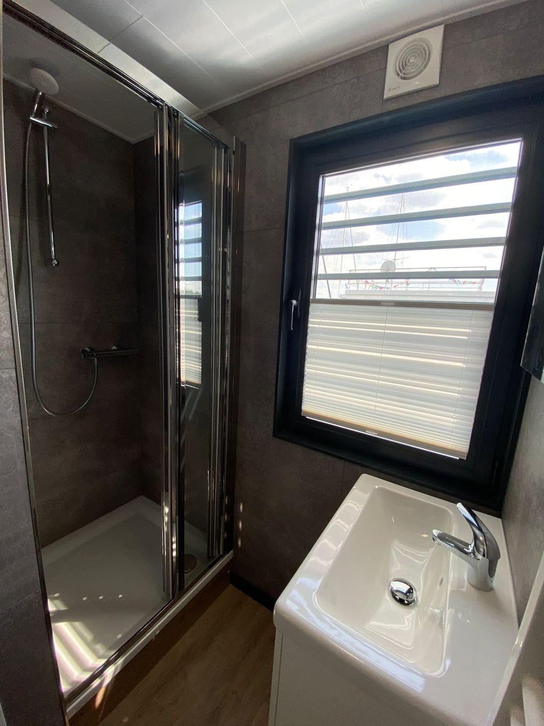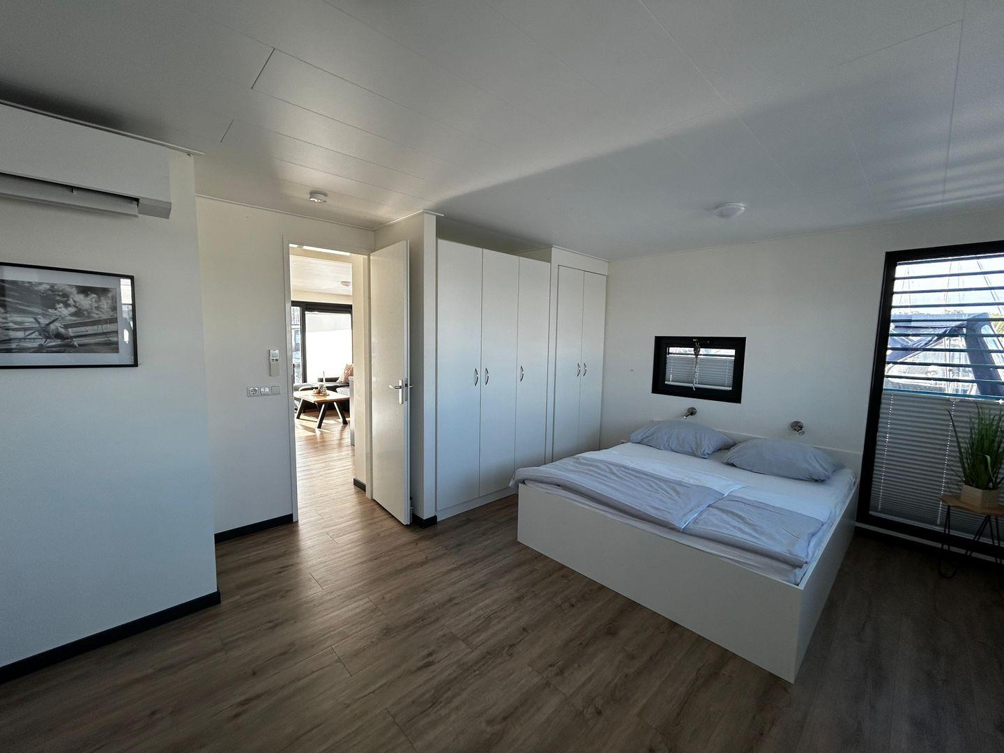 Das FLOATING 44 kann mit maximal 4 Personen belegt werden. Neben dem großzügigen Wohnbereich mit integrierter Küchenzeile und direktem Zugang zur Terrasse am Bug verfügt das FLOATING 44 über ein Schlafzimmer mit einem Doppelbett. Das Bad mit Dusche und ein WC mit Waschtisch sind jeweils separat angeordnet. Auf dem Dach bietet eine 25 qm große Terrasse zusätzliche Sonnenplätze und einen weiten Blick.