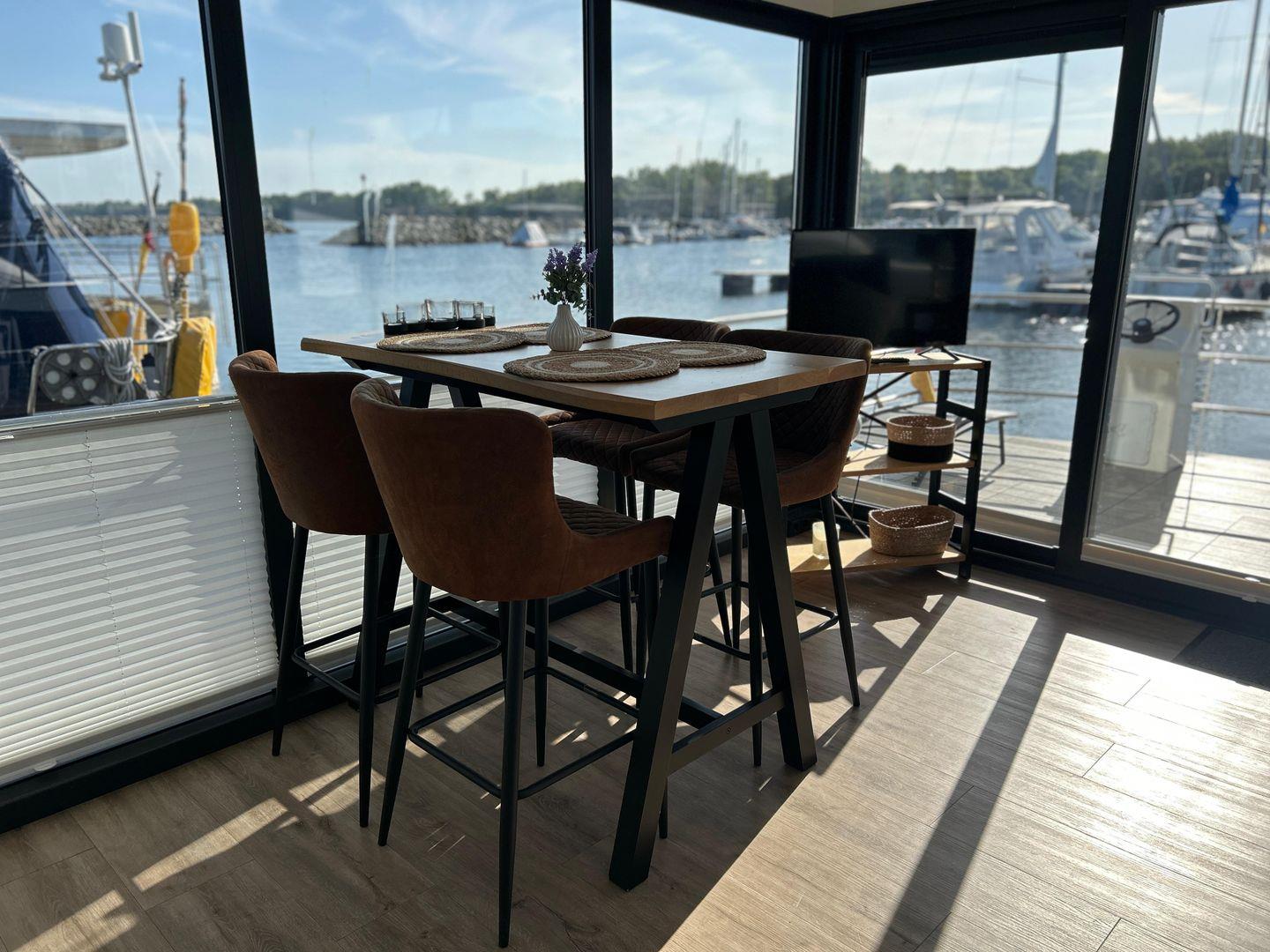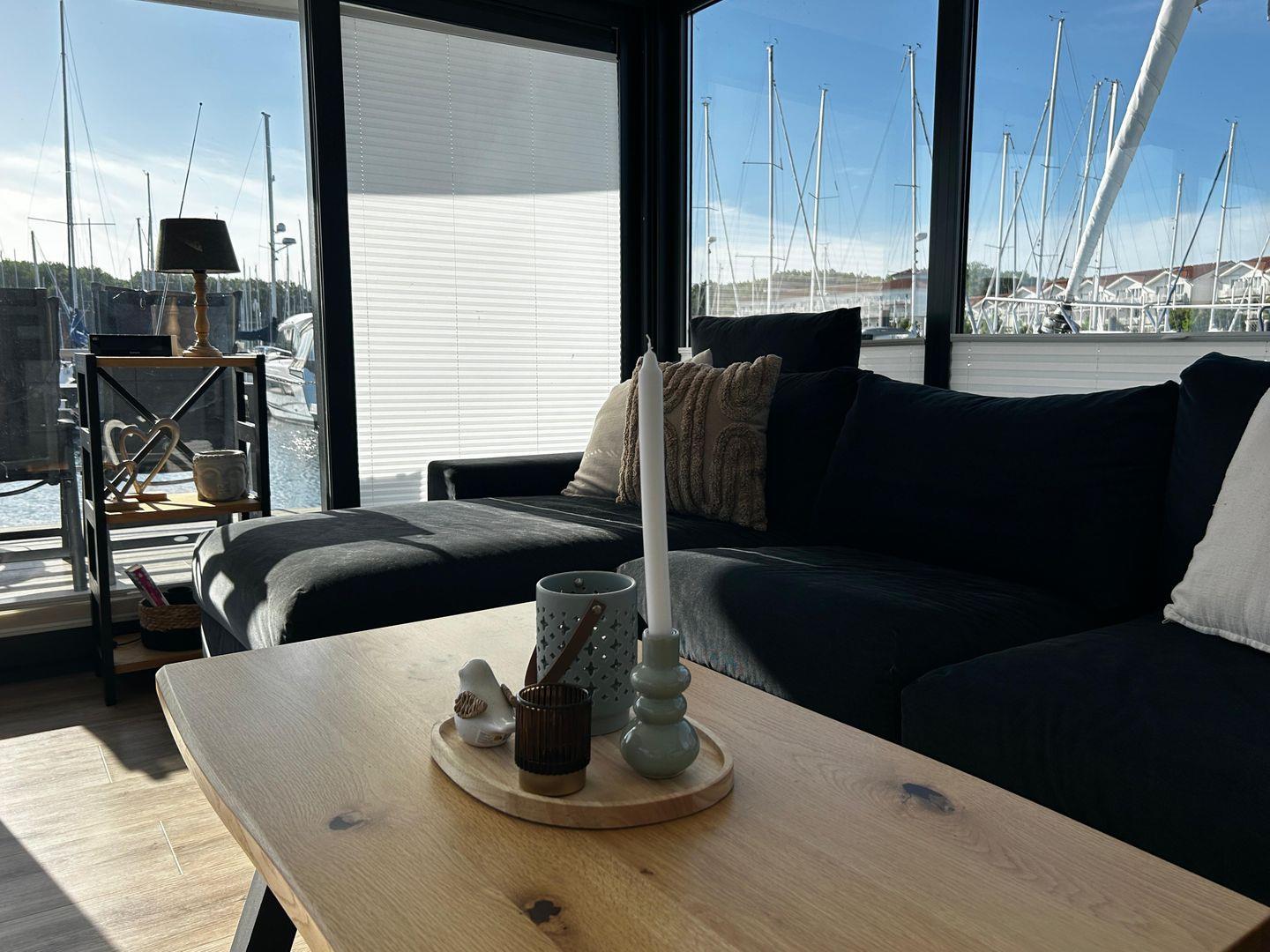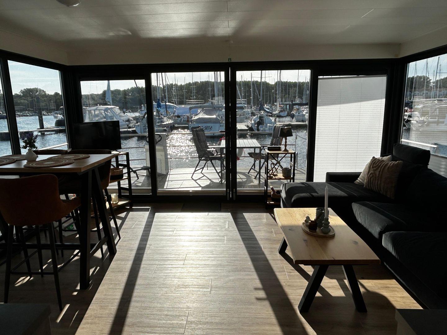 Erleben Sie das einzigartige FLOATING 44 Hausboot in Boltenhagen direkt am Wasser mit großzügiger Terrasse und moderner Ausstattung.