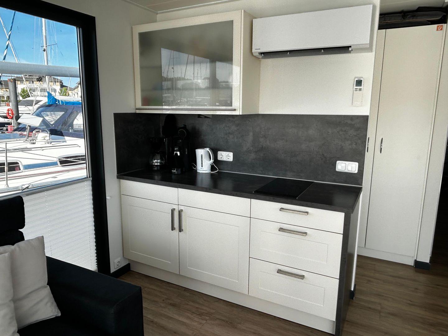 Sie verfügen über einen großzügigen Wohnbereich mit integrierter, gut-ausgestatteter Küchenzeile und direktem Zugang zur 15 qm großen Terrasse am Bug, sowie zwei Schlafzimmern.