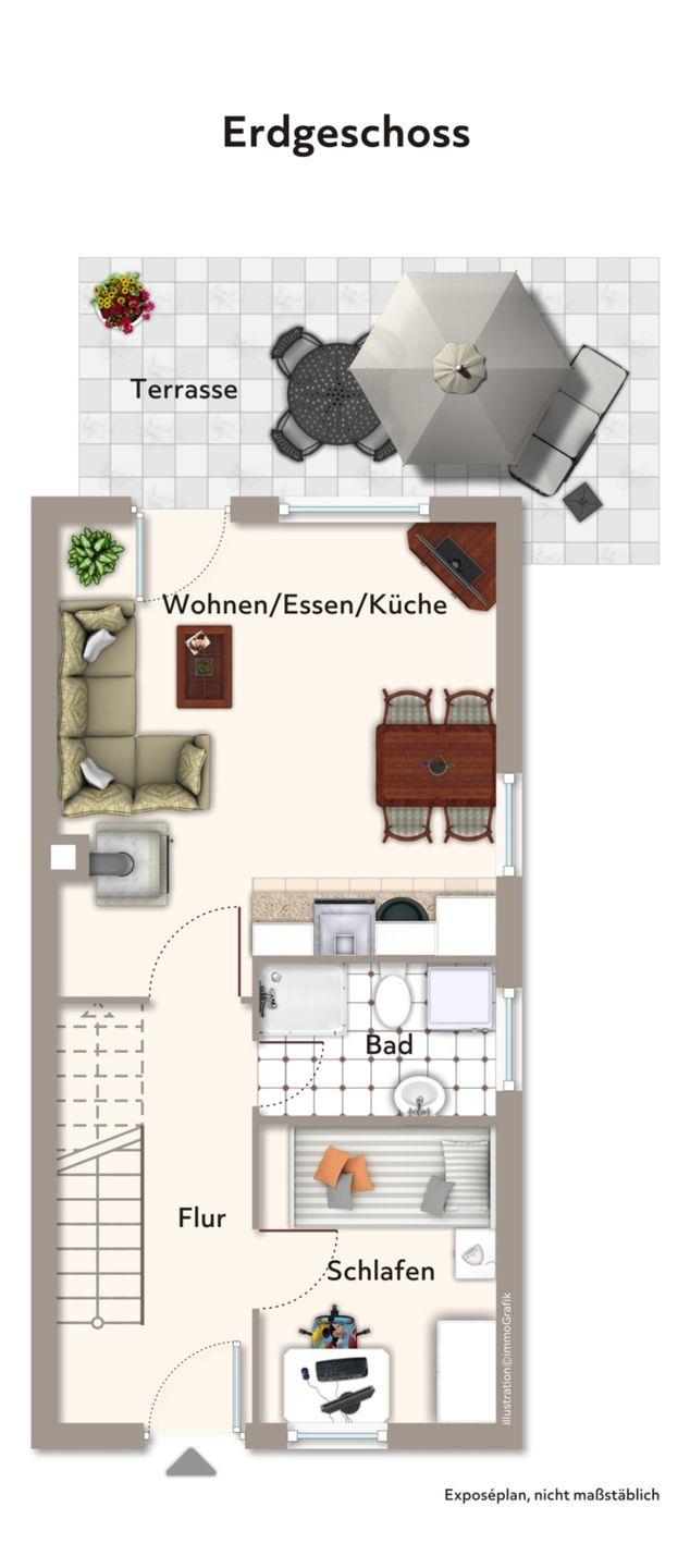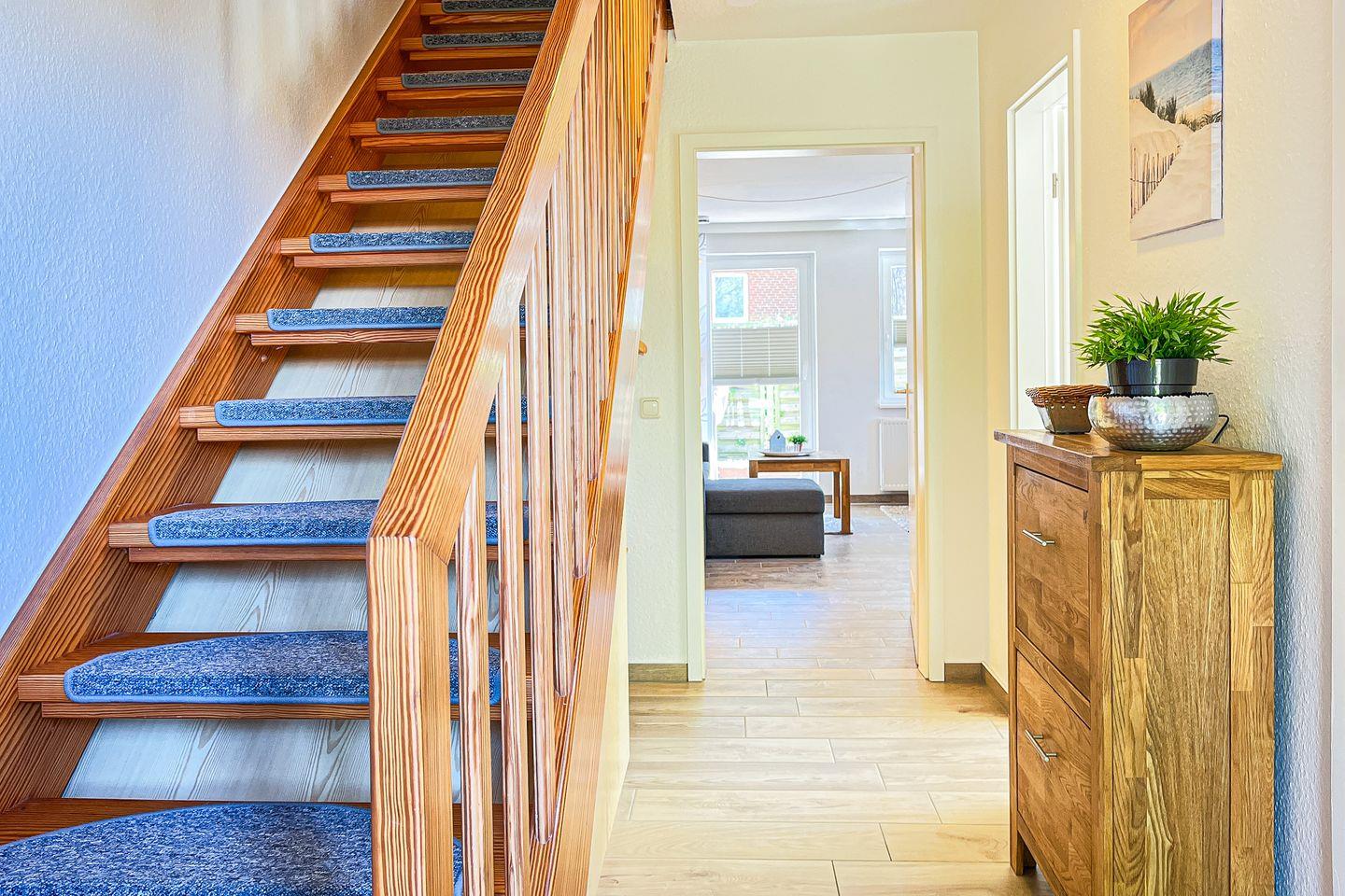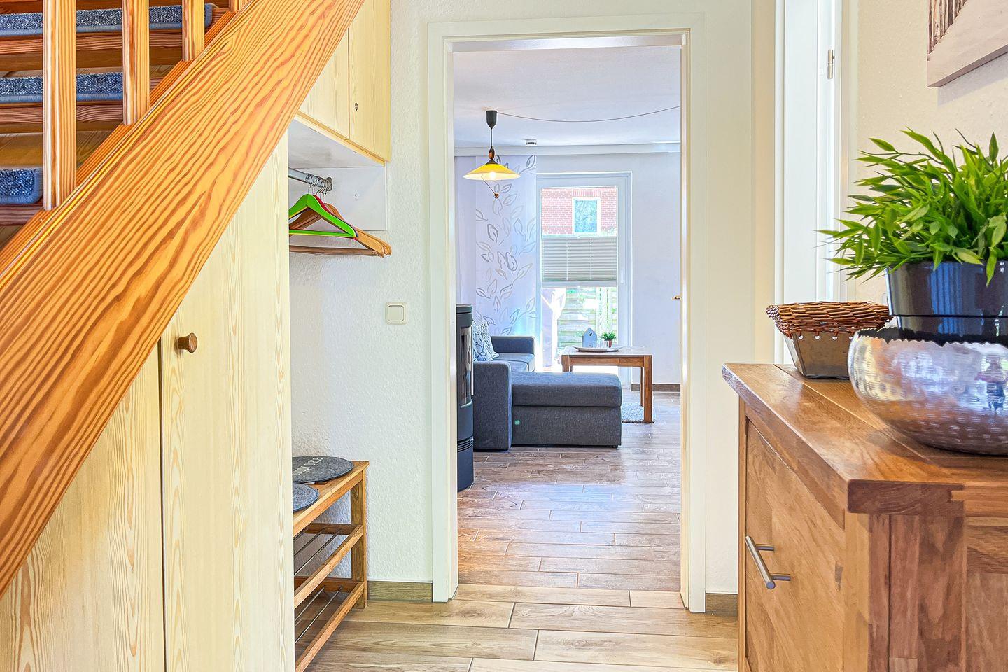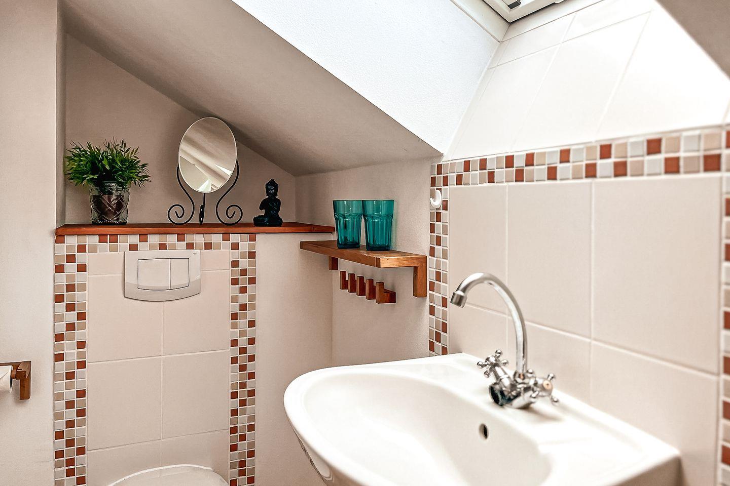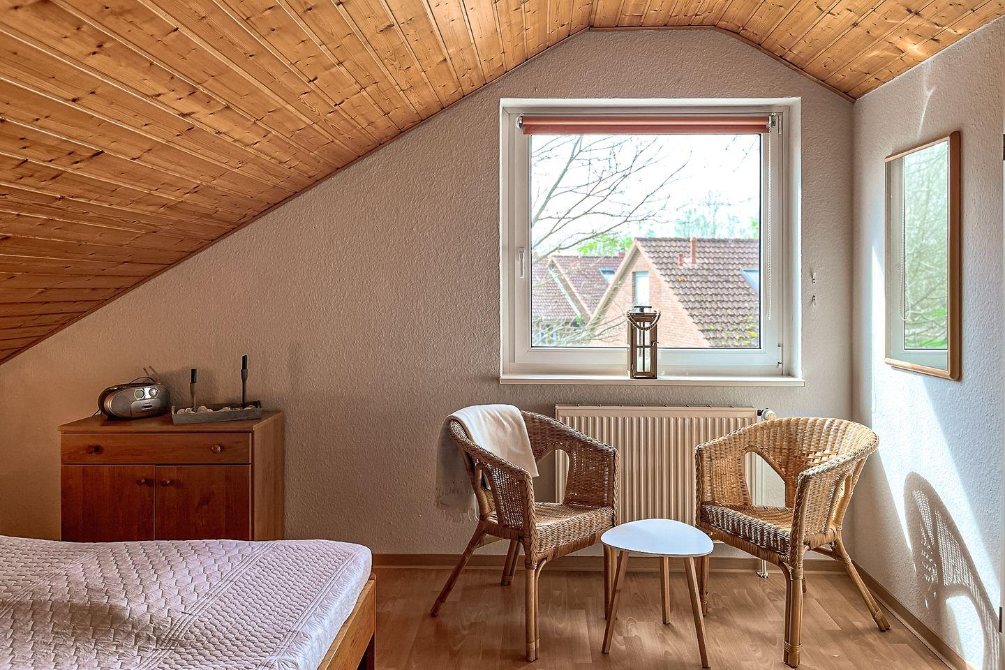 Das Duschbad im Erdgeschoss hat eine Dusche. Ein Gäste-WC findest du im Dachgeschoss vor. Dieses erreichst du über das Schlafzimmer mit Doppelbett. Zu diesem Ferienhaus gehört eine Waschmaschine. Der Boden wurde im Erdgeschoss mit Fliesen ausgelegt. Der Schlafraum im Dachgeschoss ist mit Laminat versehen. In dieser Nichtraucherwohnung sind Haustiere nicht erlaubt.