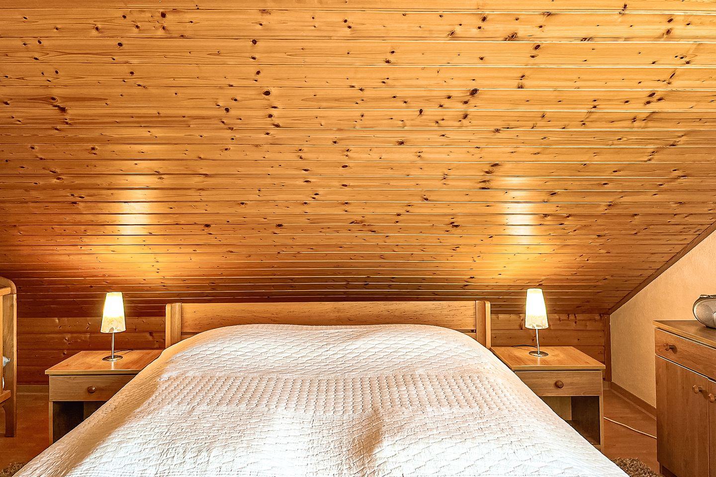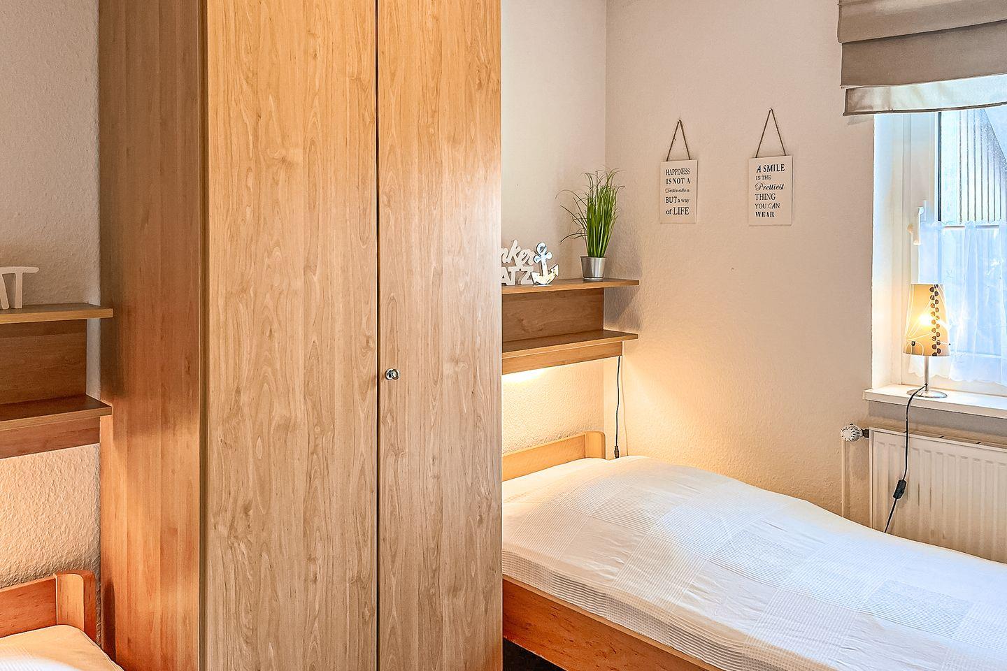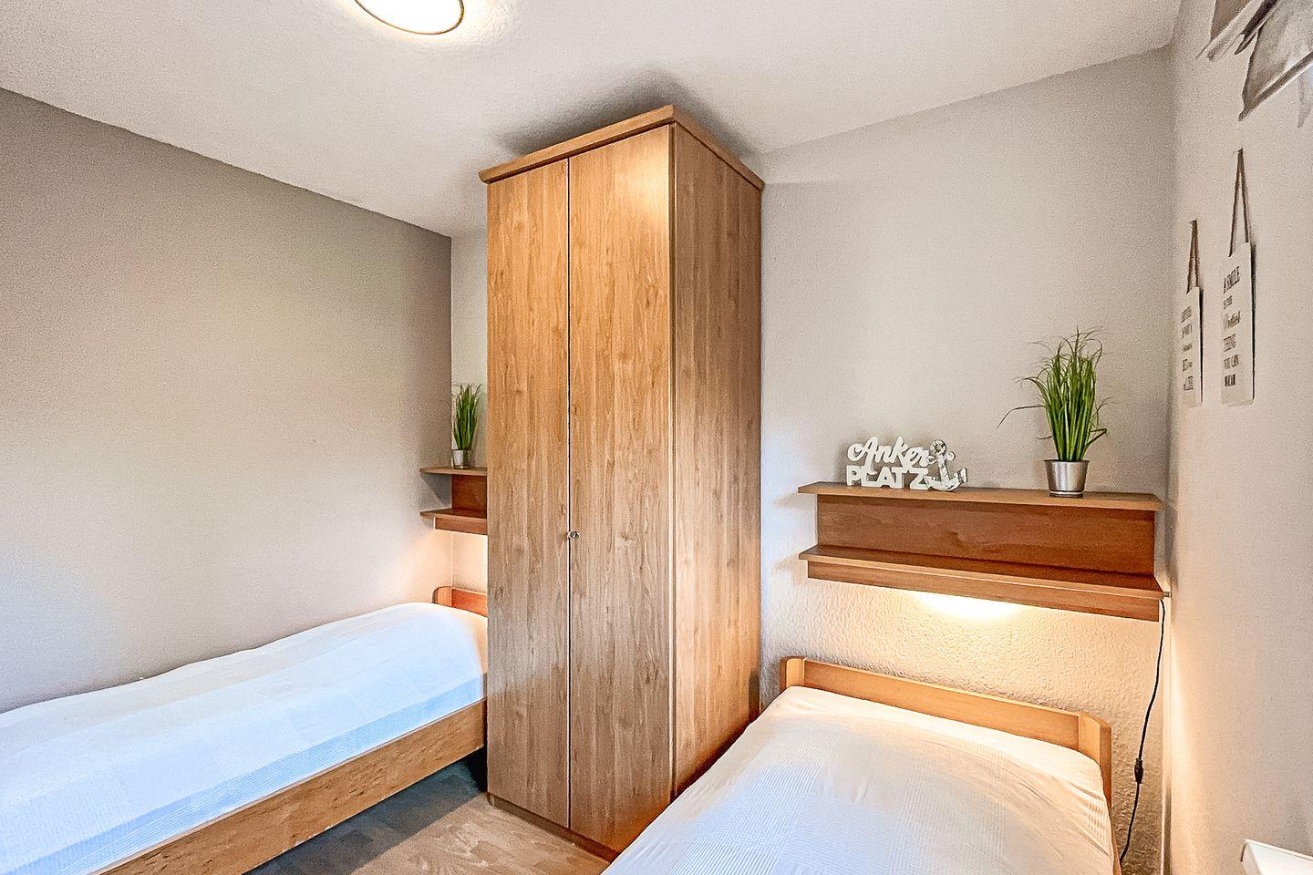 Die Schlafzimmer sind mit einem Doppelbett (2 x 90 x 200 cm) im Obergeschoss und zwei Einzelbetten (90 x 200 cm) im Erdgeschoss ausgestattet. Für einen ruhigen Schlaf kannst du die Räume selbstverständlich abdunkeln. Dein Urlaubsgepäck bringst du in den Kleiderschränken unter.