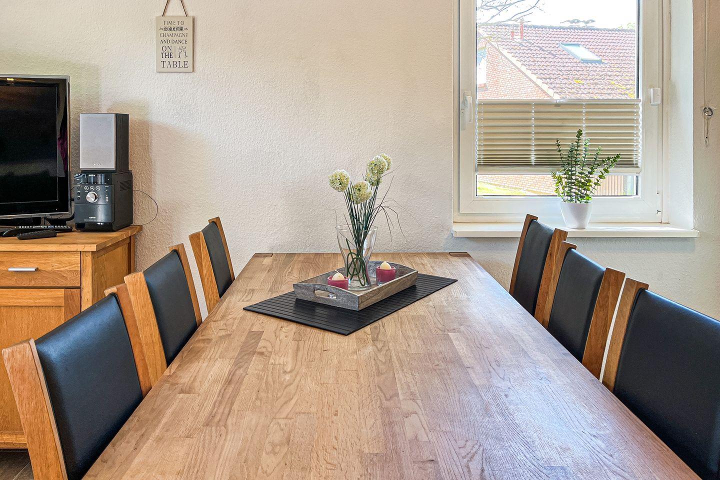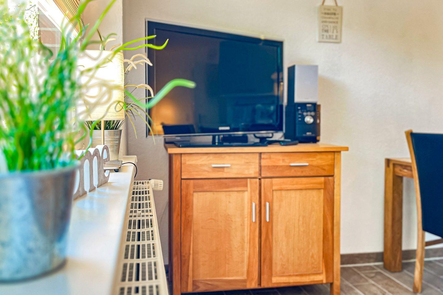 Aus dem Wohnbereich heraus gelangst du auf die möblierte Terrasse. Im Wohnzimmer befindet sich neben einem gemütlichen Sofa der Essbereich. Für deine Unterhaltung stehen ein Flachbild-TV und eine Stereoanlage zur Verfügung. Für Gemütlichkeit sorgt der Kamin.