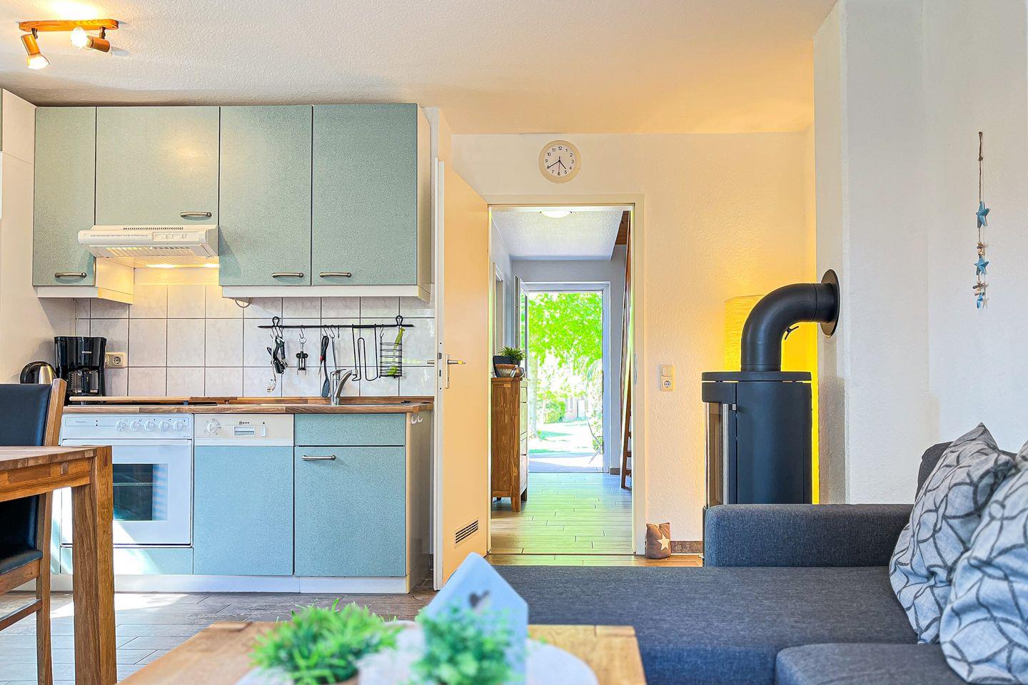 Die Küche ist vollständig ausgestattet mit: Kühlschrank mit Gefrierfach, Backofen, 4-Plattenkochfeld, Mikrowelle und Geschirrspülmaschine. Der Zubereitung kulinarischer Genüsse steht hier nichts im Wege.