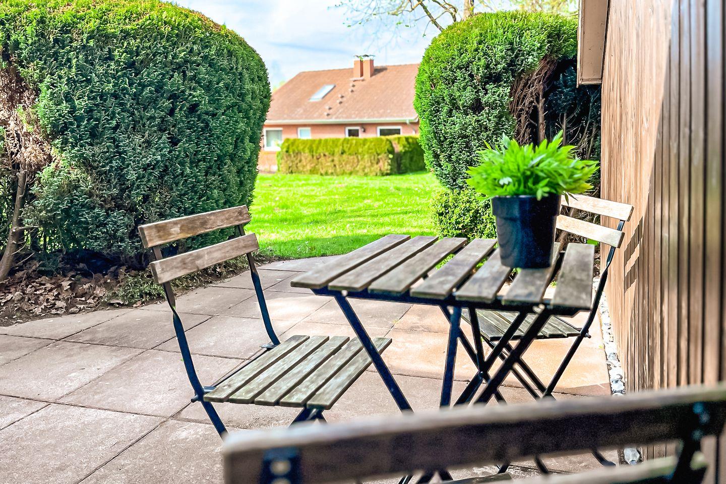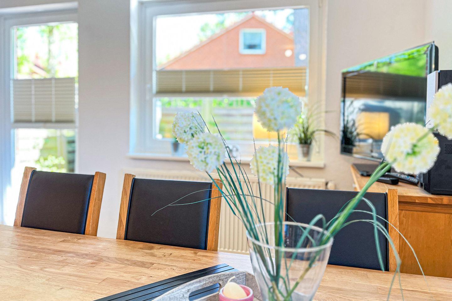 Genieß deinen Aufenthalt in diesem 3-Zimmer-Ferienhaus mit Terrasse in Süd-West-Lage. Hier verteilen sich auf 56 m² ein Wohn- und Essbereich, eine Küchenzeile, zwei Schlafräume, ein Bad und ein Gäste-WC. Die Entfernung zum Strand beträgt ca. 350 m.