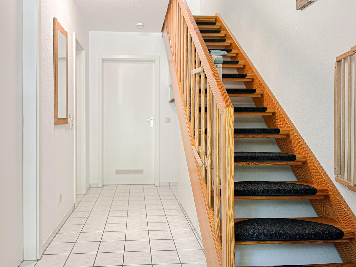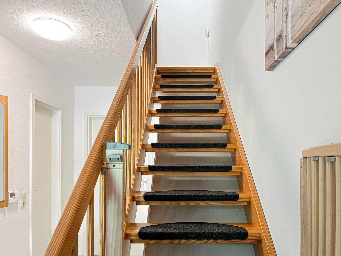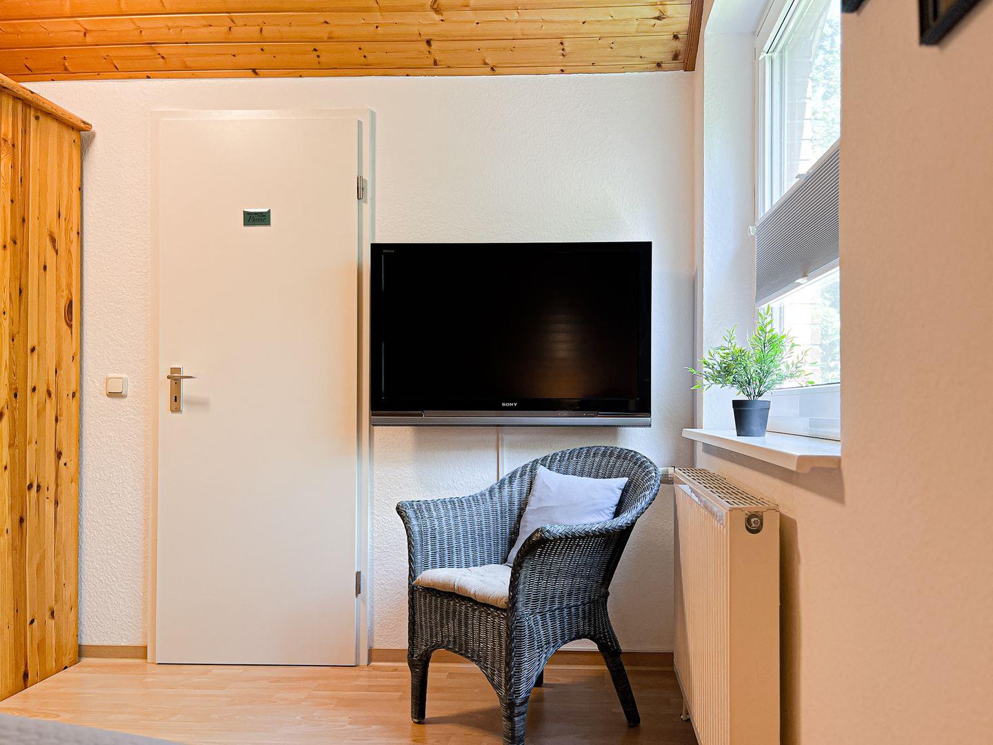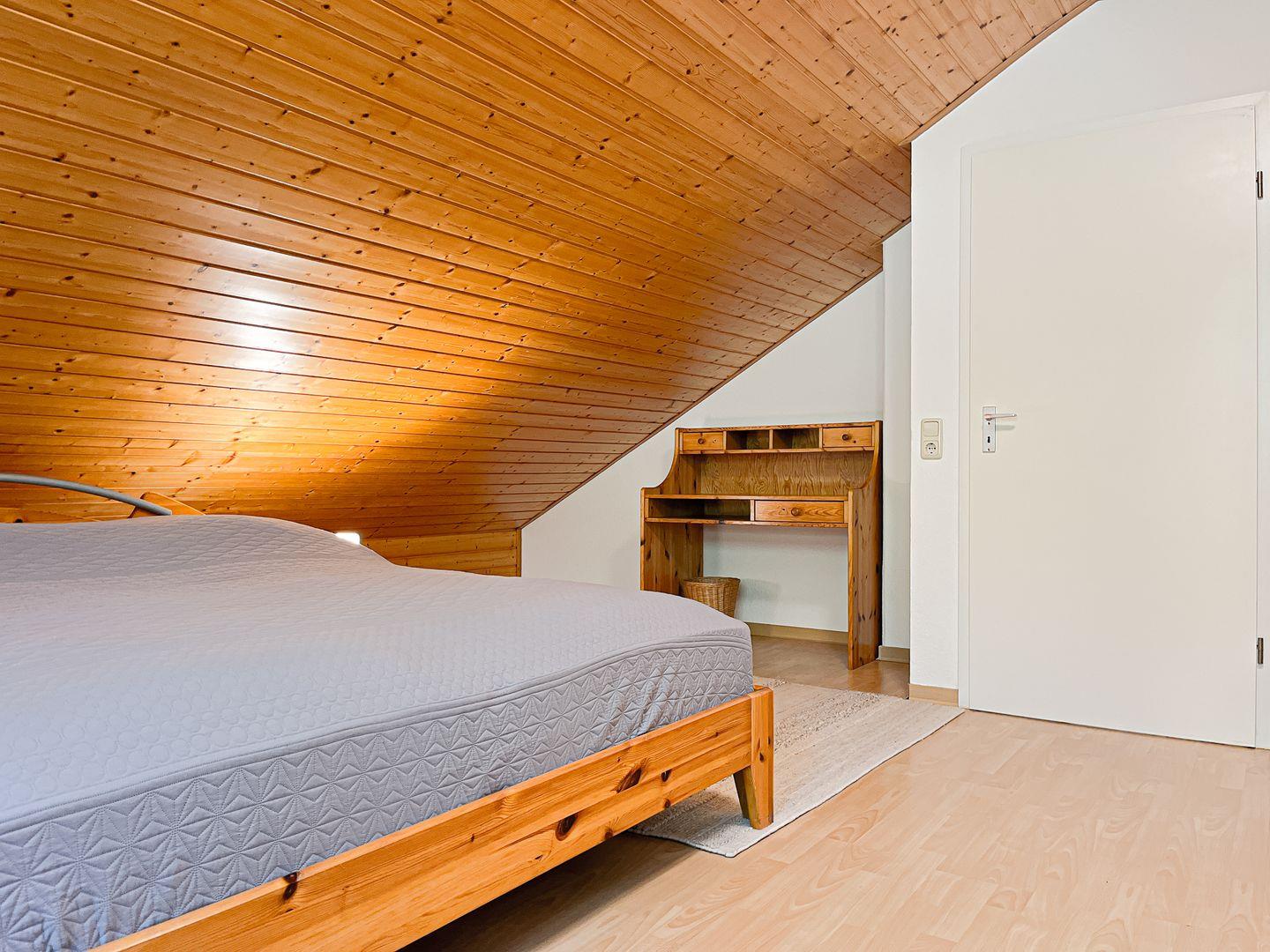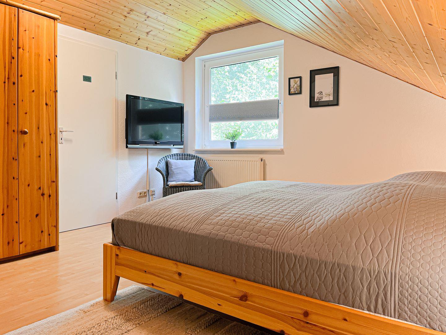 Im Obergeschoss des Ferienhauses befindet sich das zweite Schlafzimmer. Dieses ist mit einem Doppelbett (je 2 x 90 x 200 cm) und einem Kleiderschrank ausgestattet. In einem Schlafzimmer steht dir ein zweiter Fernseher zur Verfügung. Für die kleinen Gäste steht ein Kinderhochstuhl bereit. Die Fenster in den Schlafräumen können abgedunkelt werden.