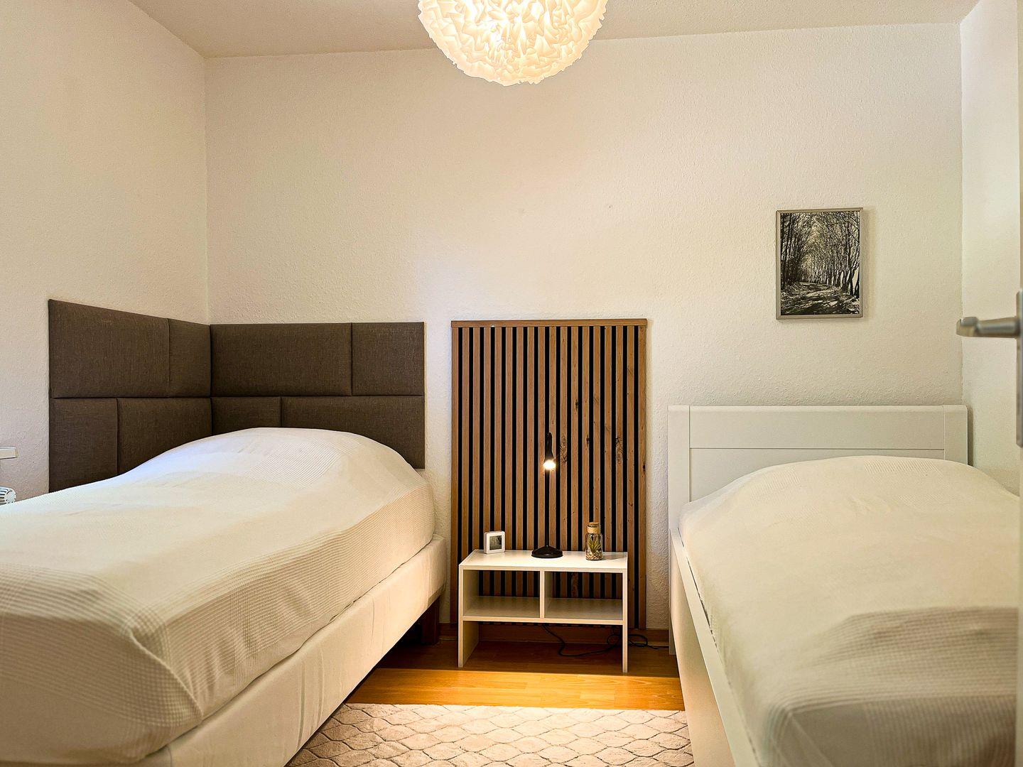 Im Erdgeschoss befindet sich das erste Schlafzimmer mit 2 Einzelbetten, einem Kleiderschrank sowie einer Kommode.