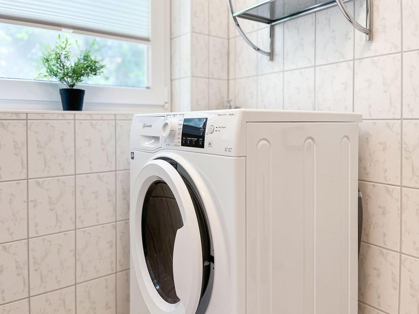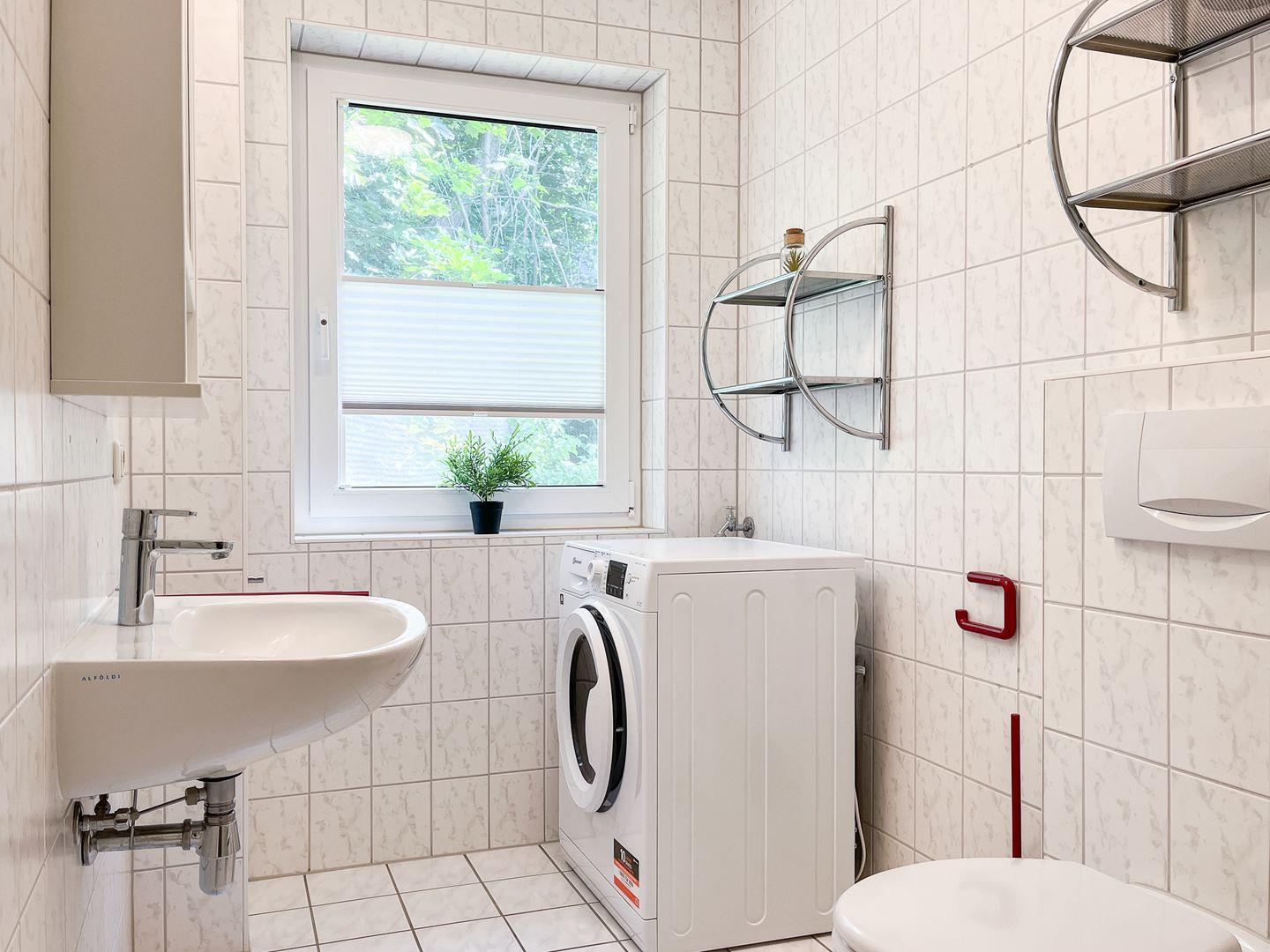 Im Bad mit Dusche/WC kannst du einen Waschtrockner nutzen.