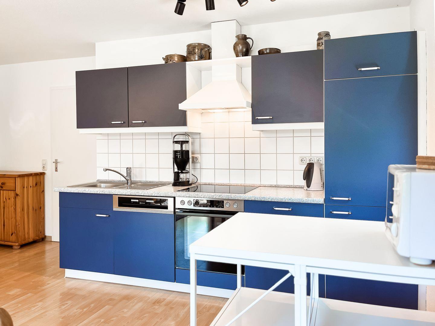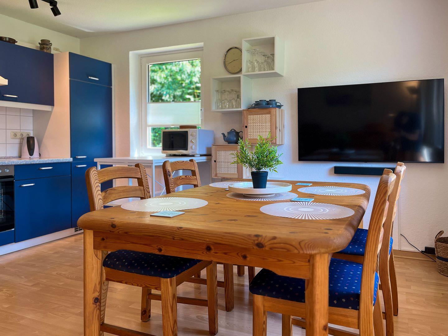 Die im Wohnbereich integrierte Küche in diesem Ferienhaus ist gut ausgestattet und verfügt selbstverständlich über einen Kühlschrank, Backofen mit 4 Platten-Induktionsherd, Geschirrspüler, Mikrowelle, Kaffeemaschine und Wasserkocher. Der gemütliche Essbereich lädt zum geselligen Beisammensein ein.