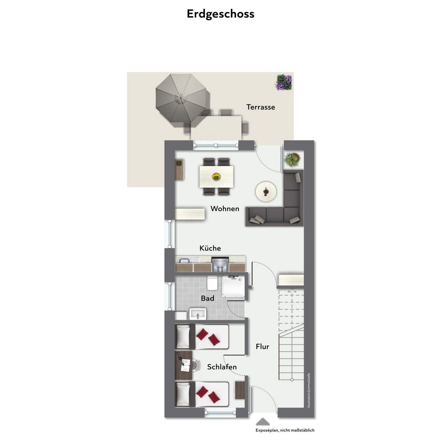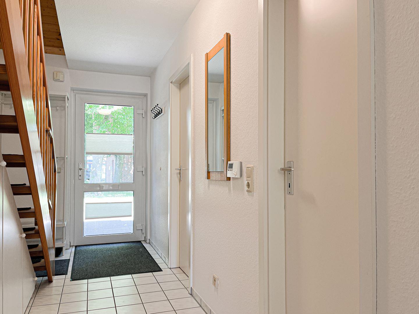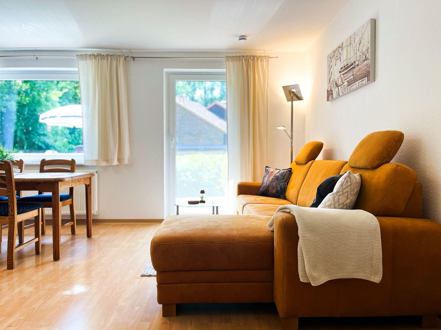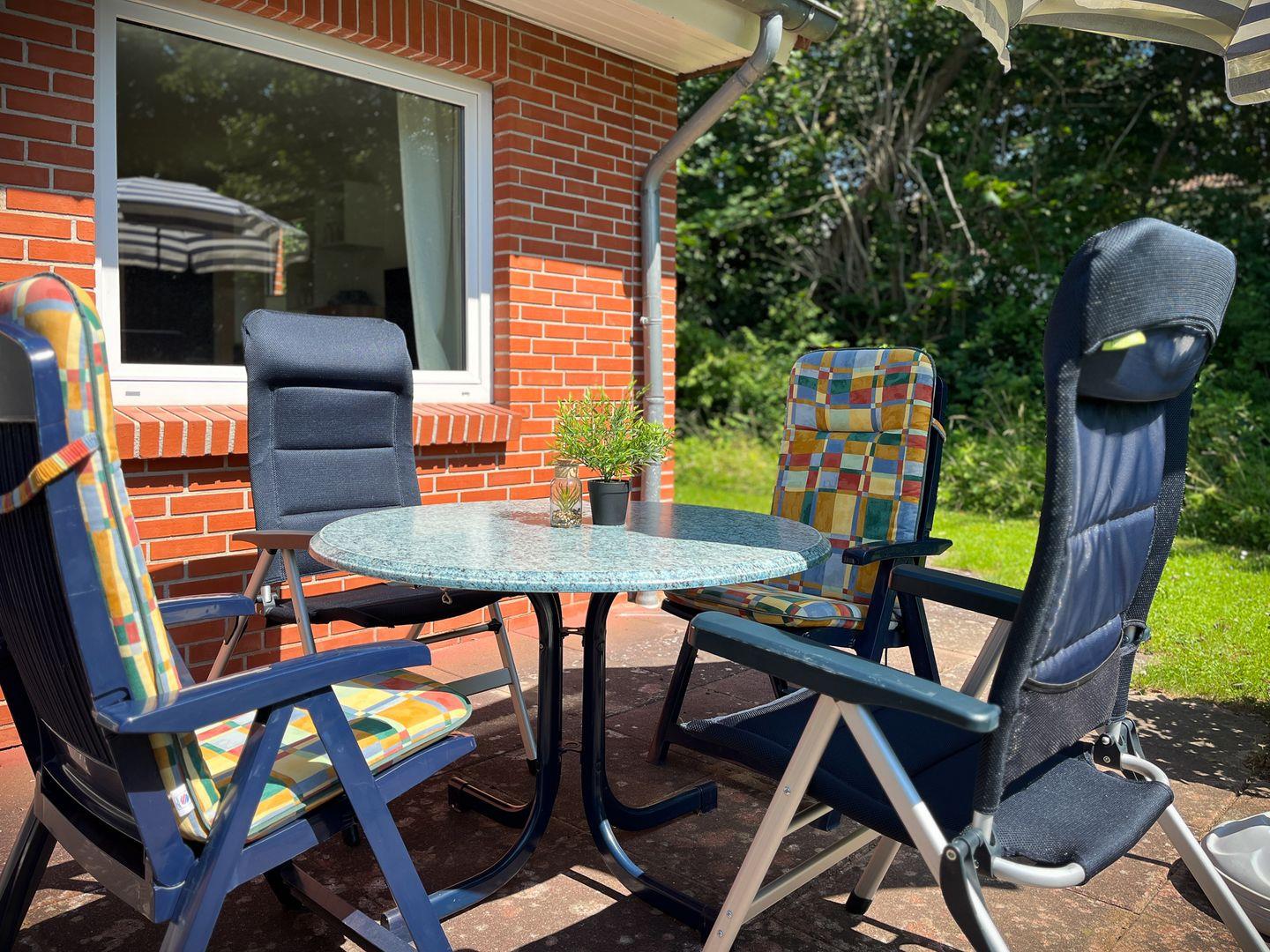 Das im Erdgeschoss gelegene, geräumige Wohnzimmer ist mit einem Sofa, welches zum Relaxen einlädt, ausgestattet. Ein Fernseher und ein Radio mit CD-Spieler sorgt für Unterhaltung. Direkt vom Wohnzimmer kommst du auf die Süd-West-Terrasse. Selbstverständlich stehen Gartenmöbel mit Auflagen zur Verfügung.