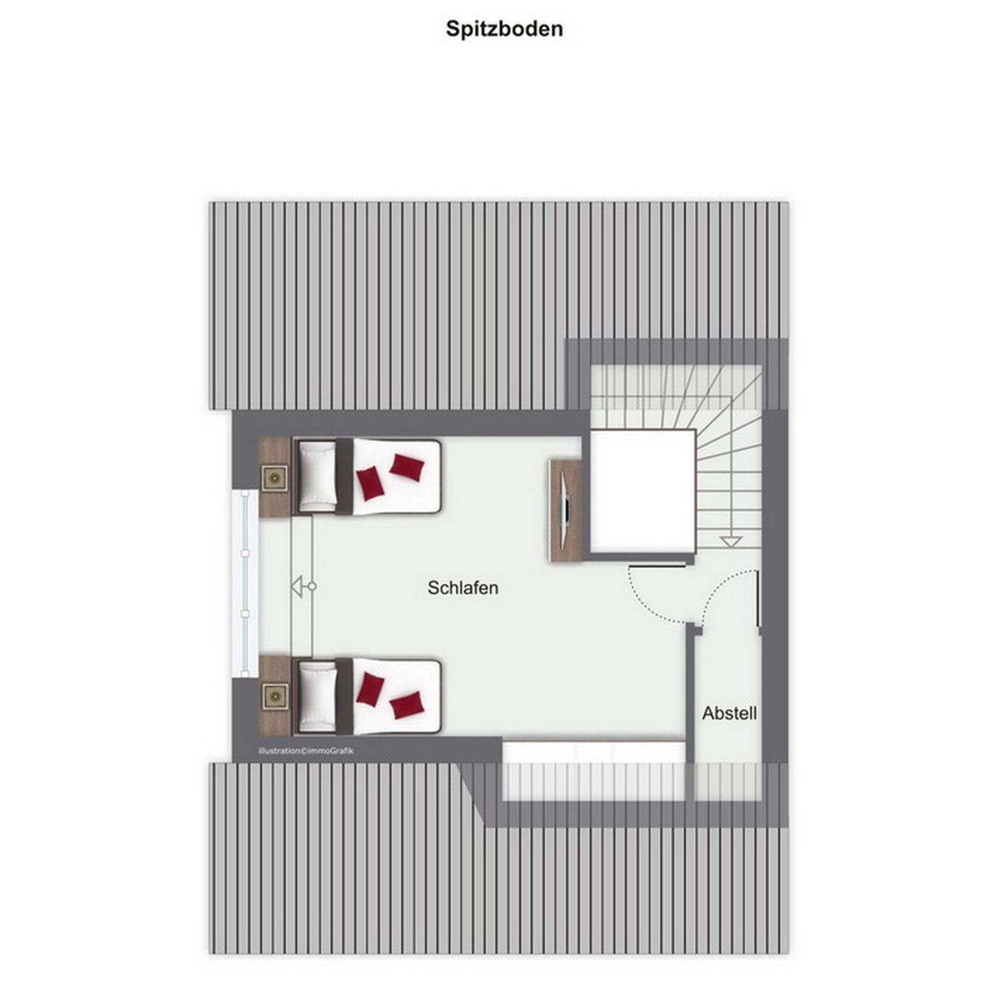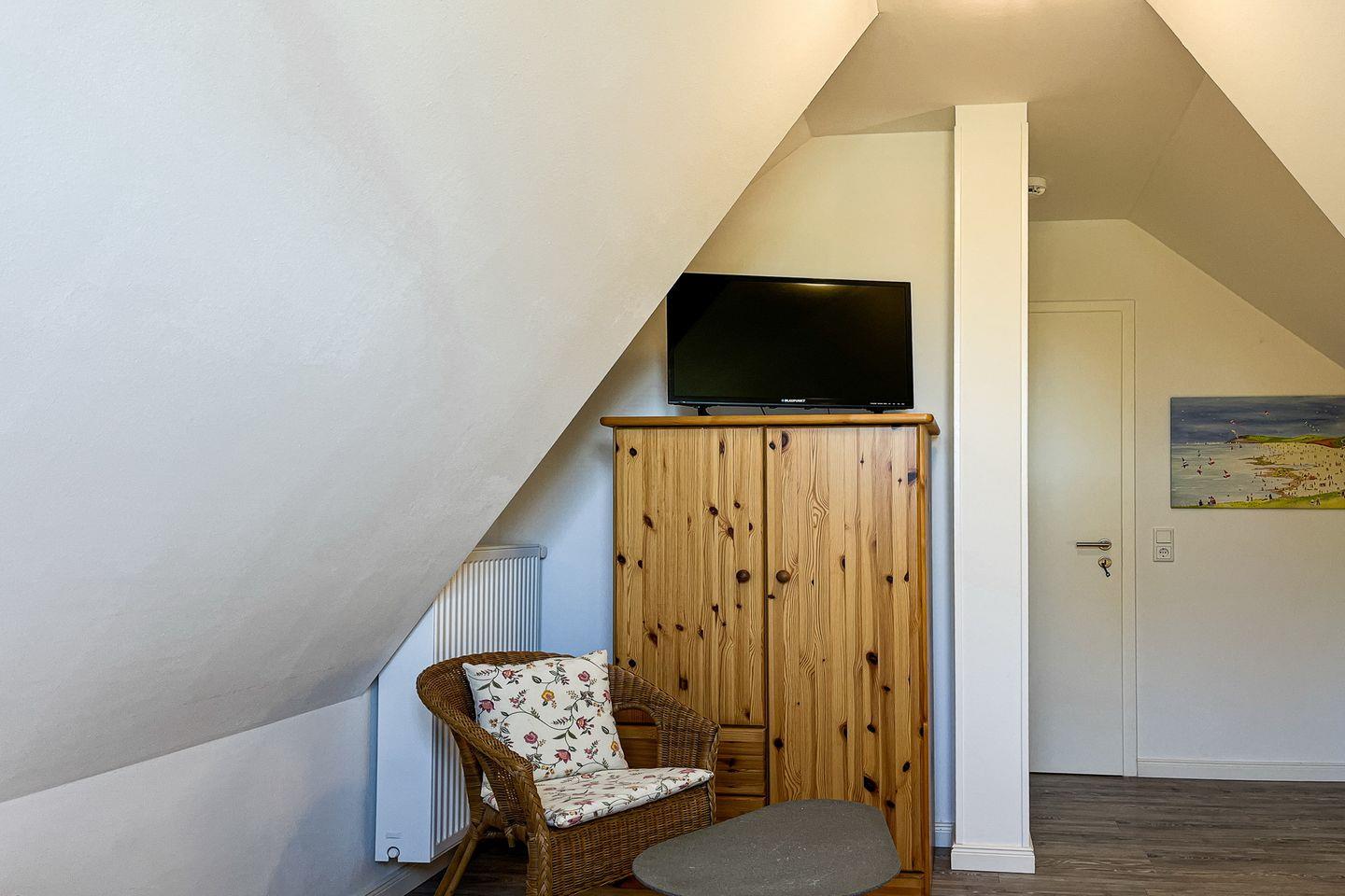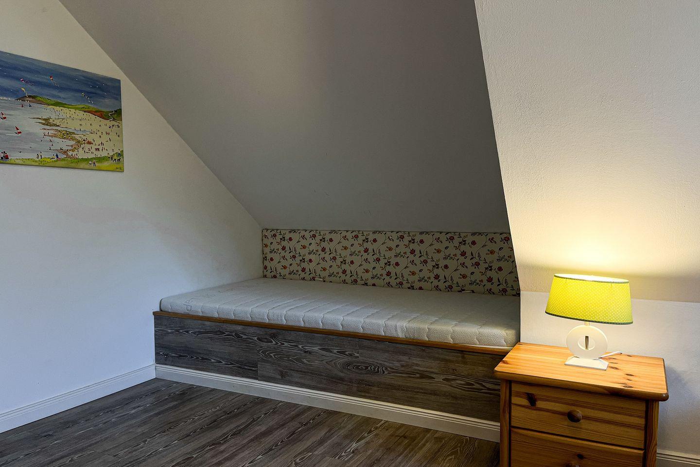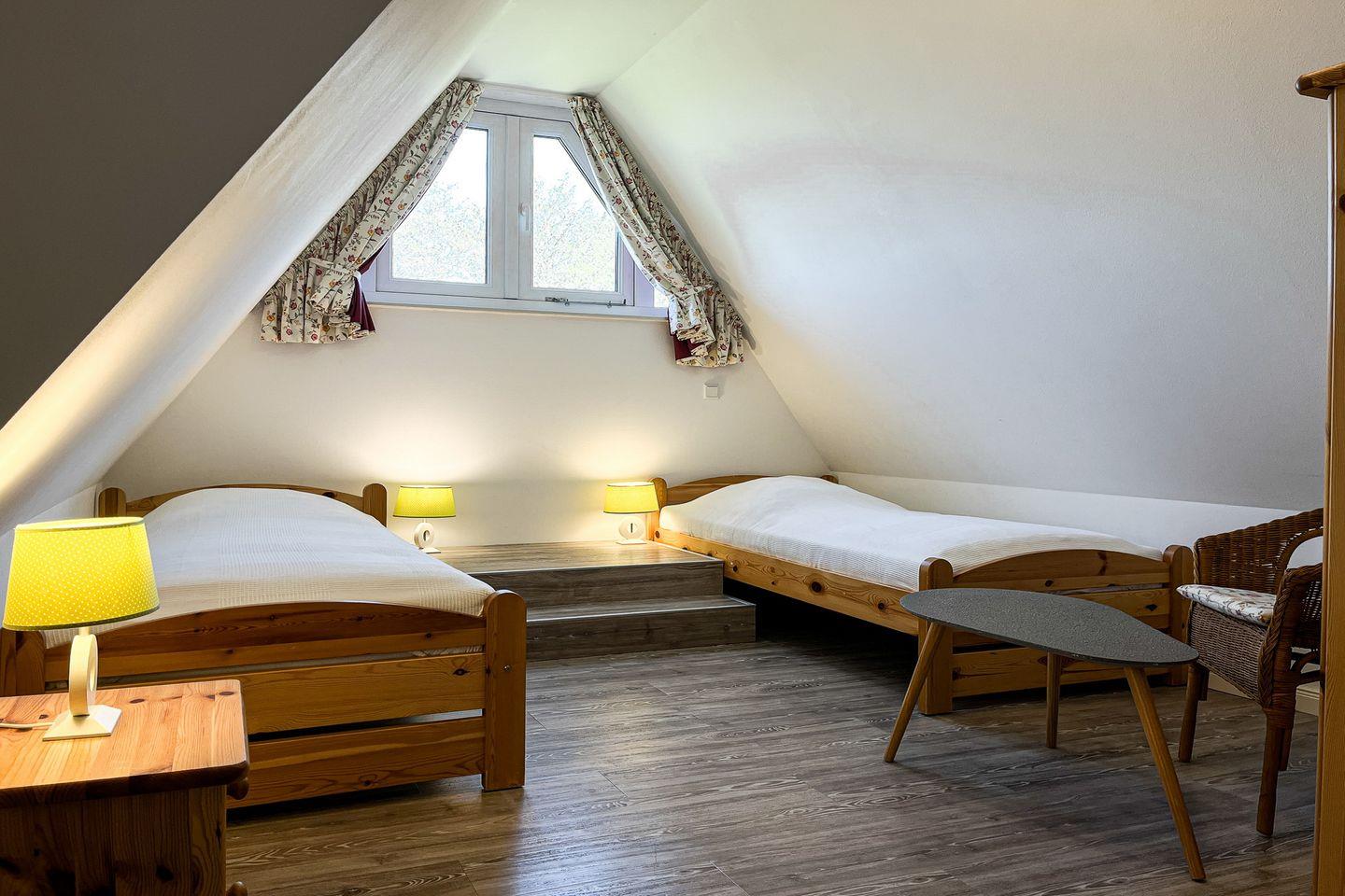 Im Spitzboden befindet sich ein weiteres Schlafzimmer mit 2 Einzelbetten (90 x 200cm) und eine Schlafnische (90 x 190cm).