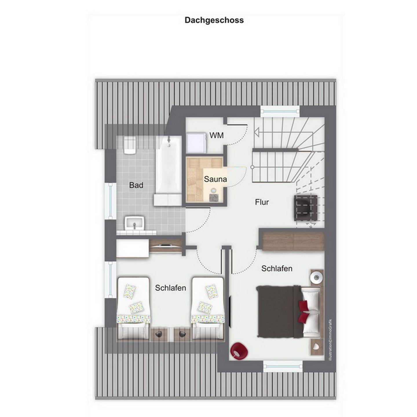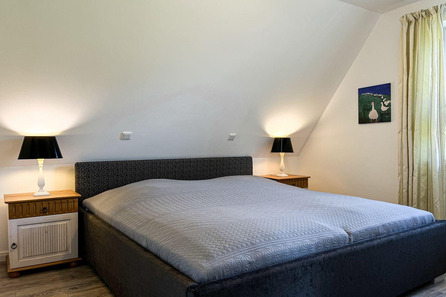In den zwei Schlafzimmern im Dachgeschoss stehen Dir Doppelbetten (2x 90 x 200cm) und Schränke mit ausreichend Platz für Deine Urlaubsgarderobe zur Verfügung. Des Weiteren verfügt das Dachgeschoss über ein Bad mit Badewanne und integrierter Dusche sowie den Flur.