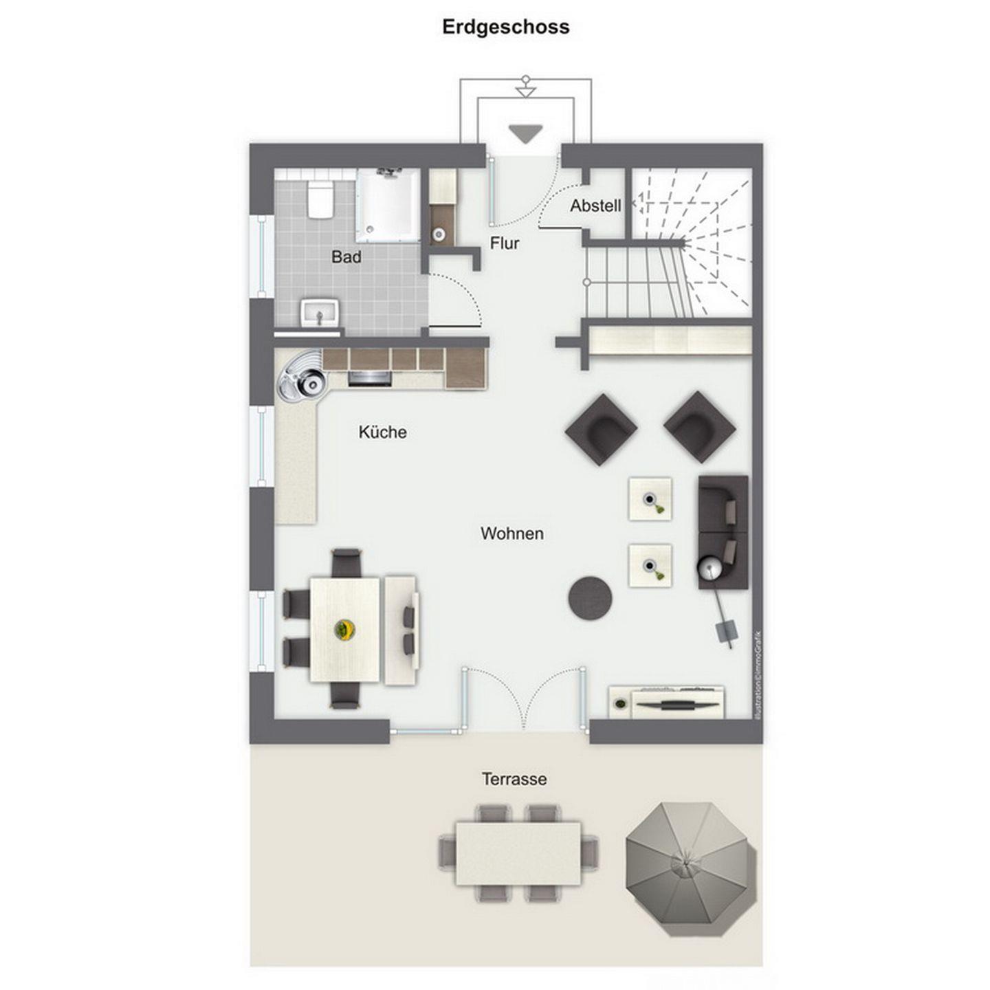 Im Erdgeschoss des Ferienhauses befinden sich der Wohnraum, eine gemütliche Essgruppe, ein Sofa sowie die integrierte Küchenzeile. Auch das Gäste-WC mit bodengleicher Dusche sowie der Eingangsbereich befinden sich hier.