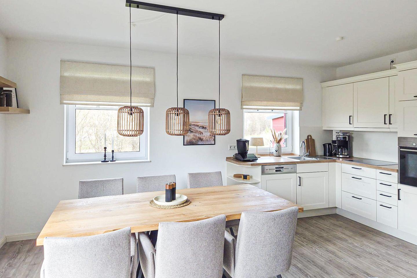 Der Zugang zur möblierten Süd-/West-Terrasse, ausgestattet mit einem Strandkorb, erfolgt direkt vom Wohnzimmer aus. Zur Unterhaltung stehen Dir ein Flachbild-TV, DVD-Player und eine Stereoanlage zur Verfügung. In der modernen Küchenzeile findest Du einen Geschirrspüler, einen Thermomix (TM7 mit Cookidoo-Abo), einen Herd mit Cerankochfeld sowie einen Backofen und einen Kühlschrank mit Gefrierfach vor.
