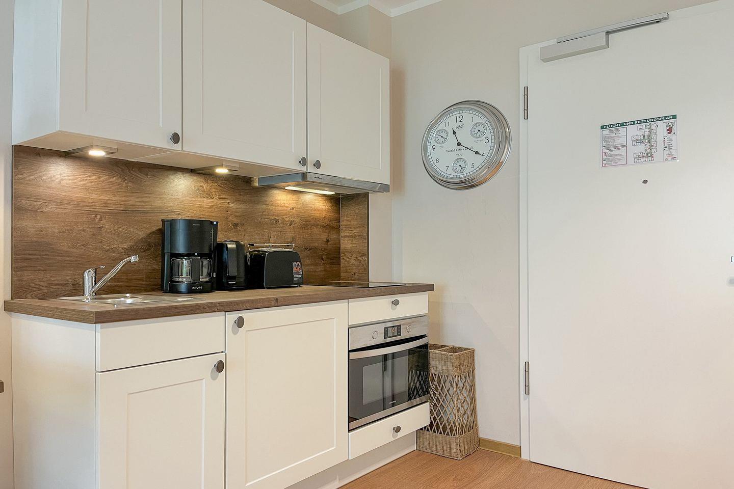 Die Küche ist offen zum Wohnbereich gestaltet und mit Cerankochfeld, Backofen, Kühlschrank mit Gefrierfach, Kaffeemaschine, Wasserkocher, Toaster sowie allen notwendigen Küchenutensilien ausgestattet – perfekt für Selbstversorger.
