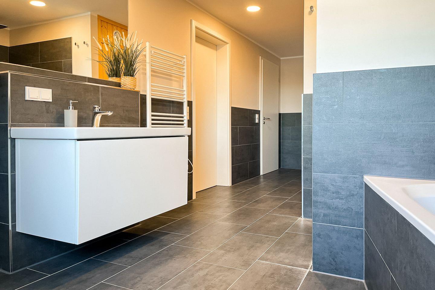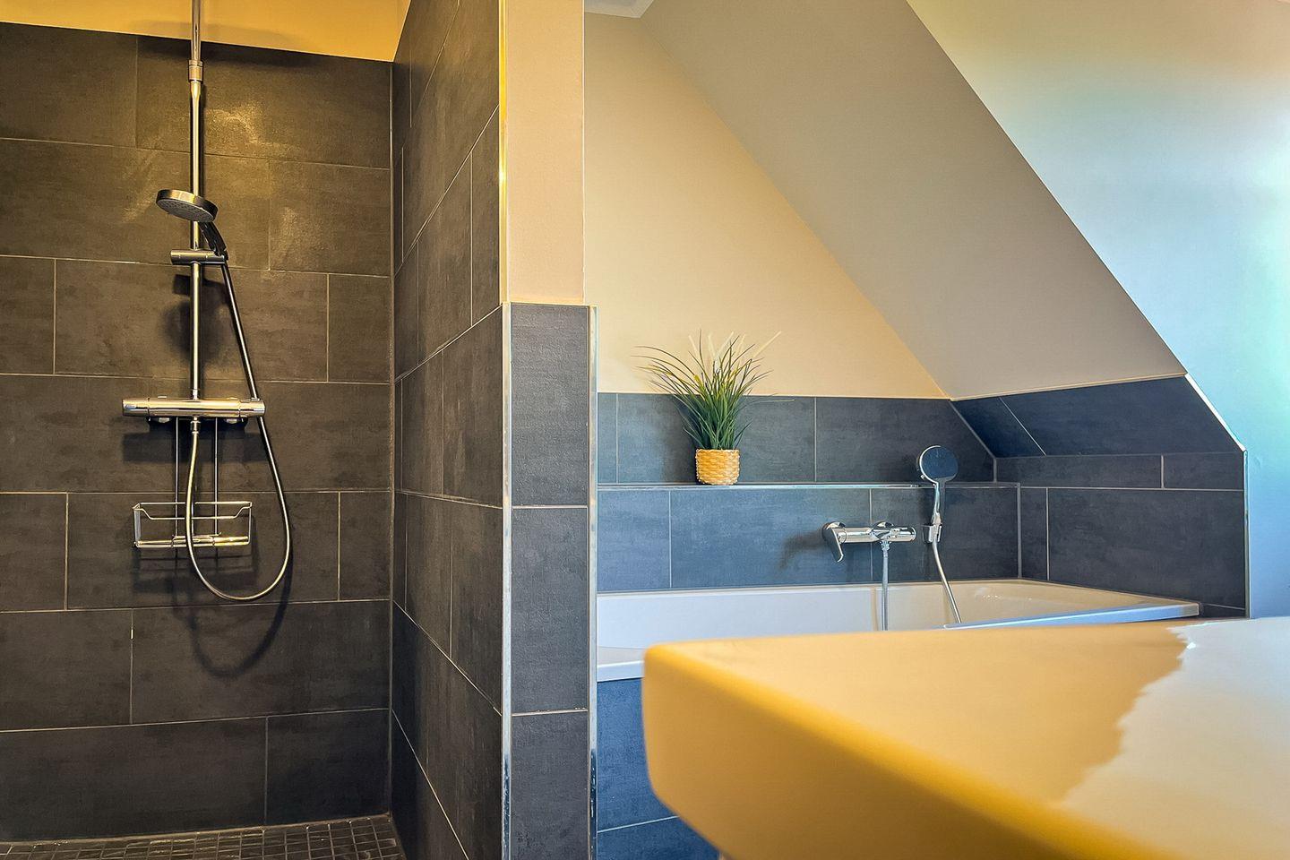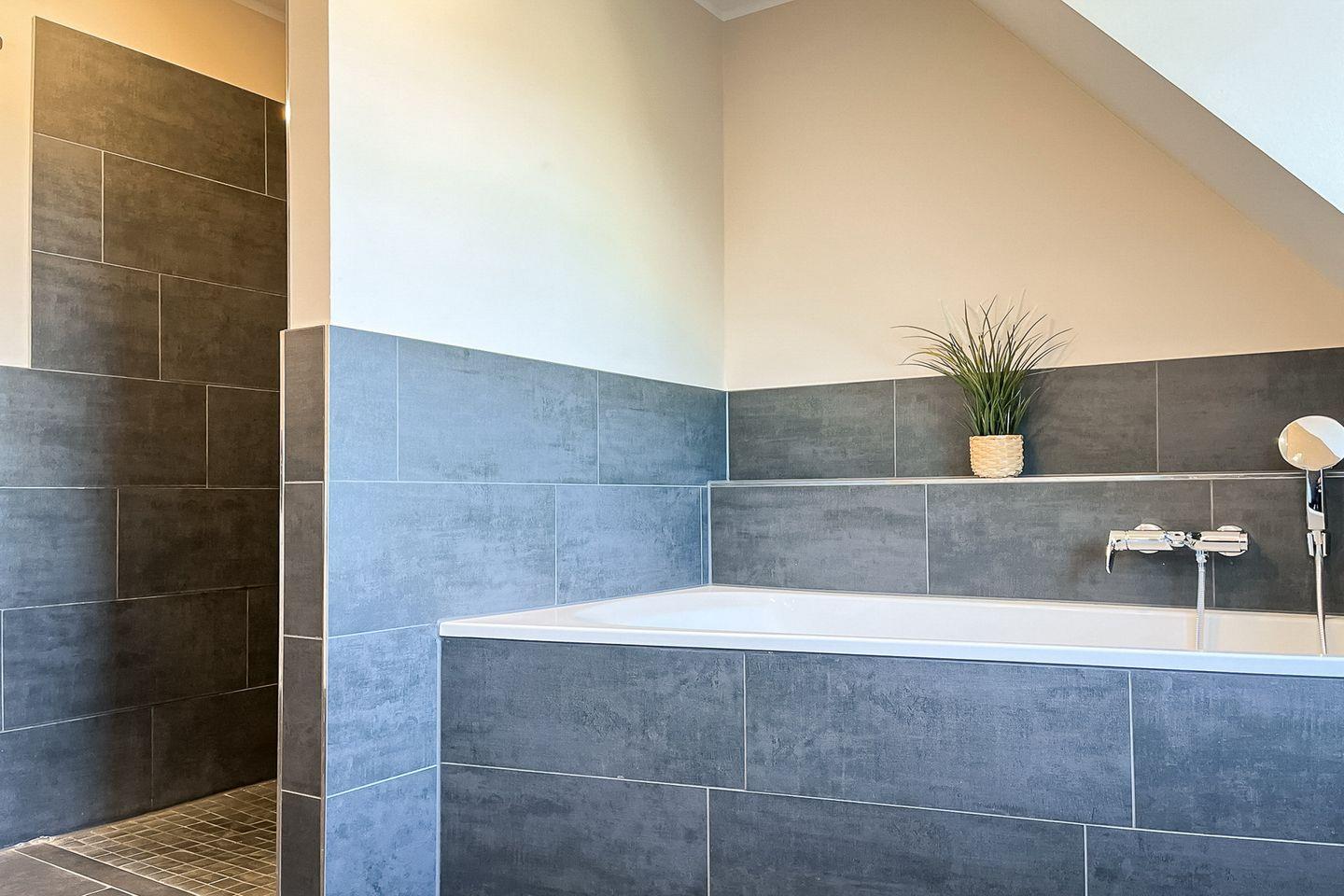 Das großzügige Badezimmer bietet echten Wellnesskomfort: Neben einer bodengleichen Dusche findest Du hier auch eine Badewanne – ideal zum Entspannen nach einem aktiven Tag an der Ostsee. Das WC ist im Bad zusätzlich separiert.