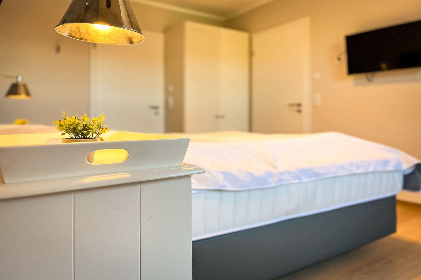 Das separate Schlafzimmer ist mit einem Doppelbett (2x 90x200?cm) ausgestattet – ideal für ruhige Nächte. Auch hier steht Dir ein weiterer Fernseher zur Verfügung. Das Schlafsofa im Wohnzimmer kann als ein weiterer Schlafplatz genutzt werden.