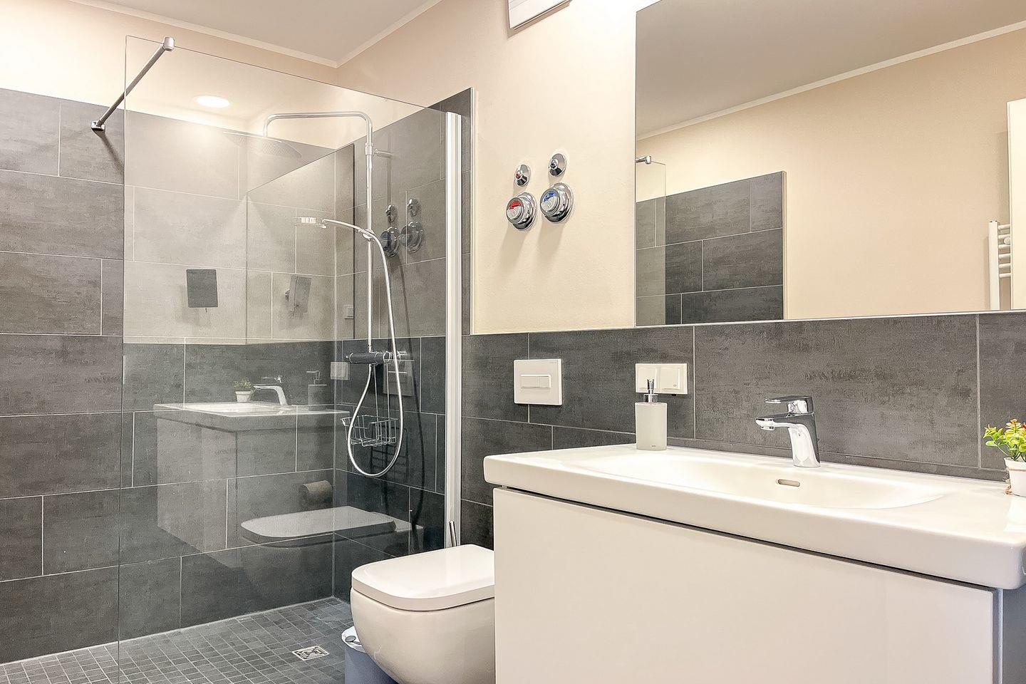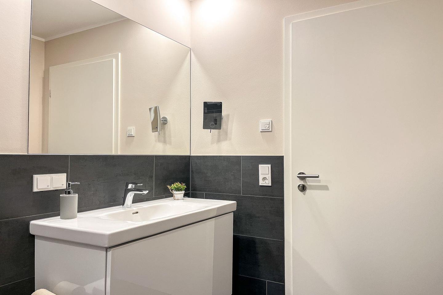 Das kompakte Badezimmer bietet eine bodengleiche Dusche, WC, Waschbecken, Kosmetikspiegel und Haartrockner – alles Notwendige für Deinen Komfort.
