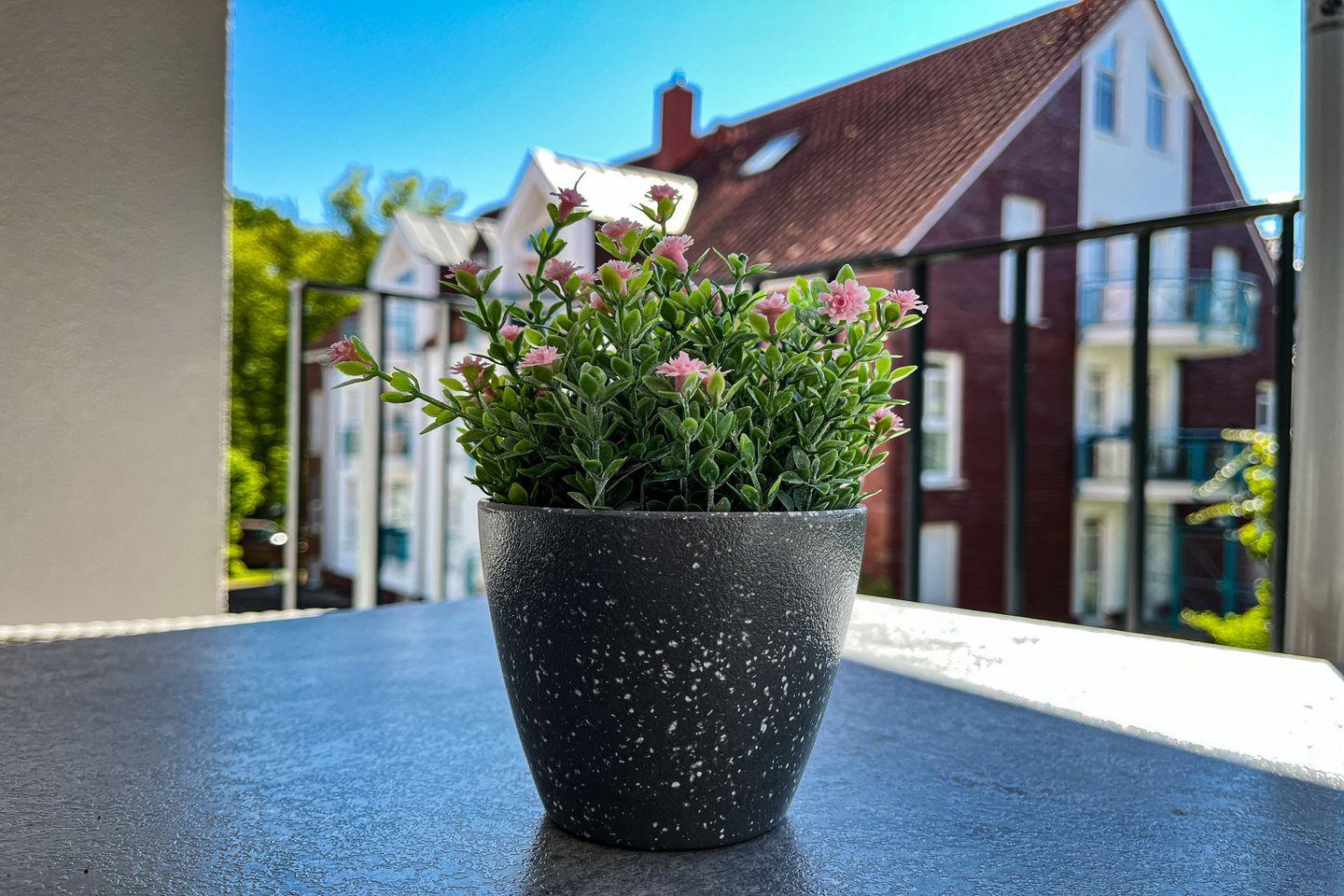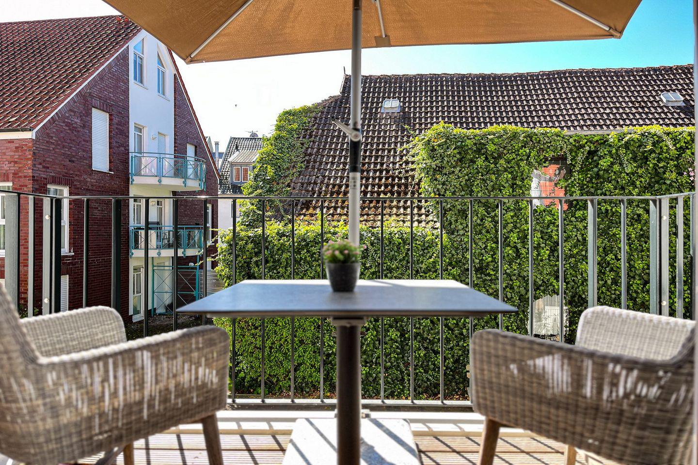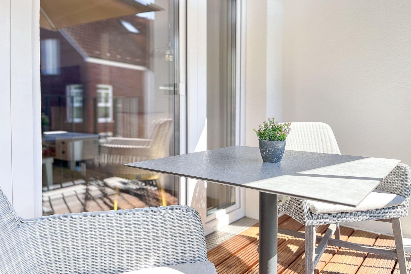 Ein echtes Plus dieser Wohnung ist der Balkon mit Gartenmöbeln und Sonnenschirm – ein angenehmer Ort für ein Frühstück an der frischen Luft oder einen ruhigen Abend mit einem Glas Wein.