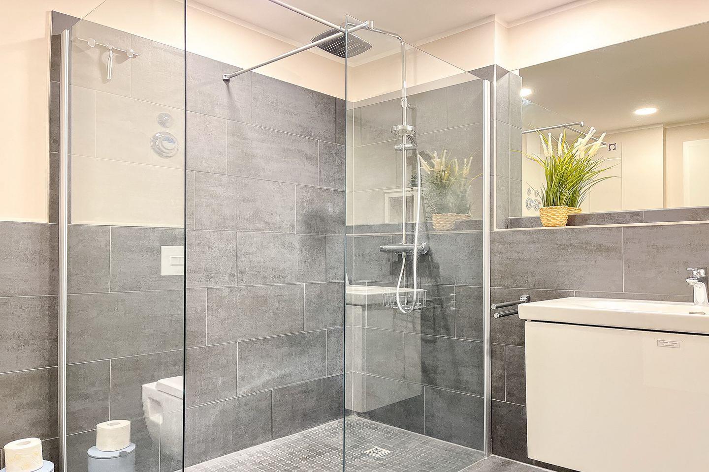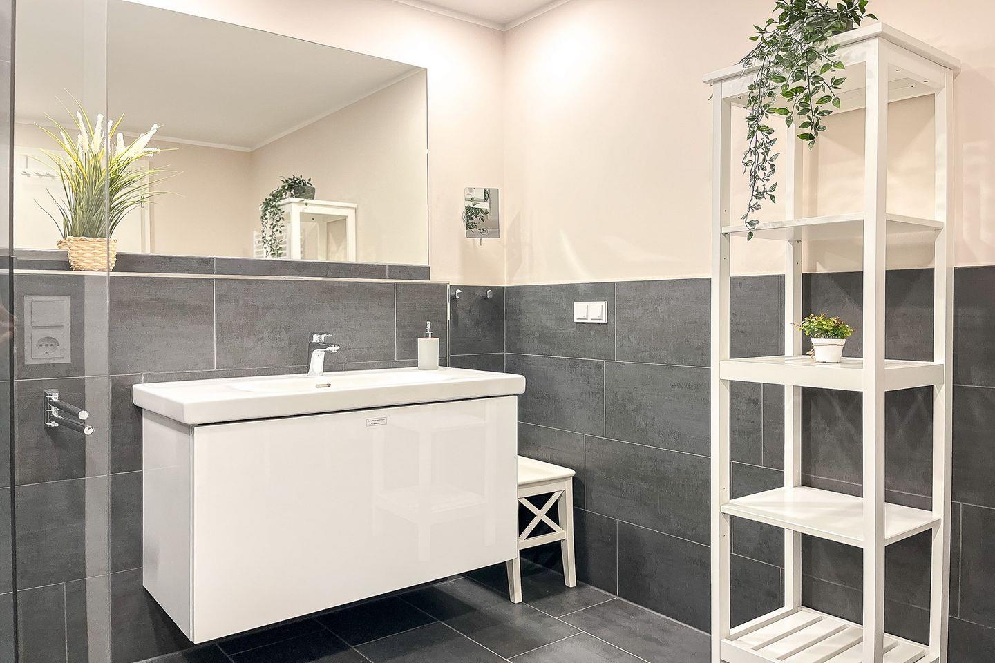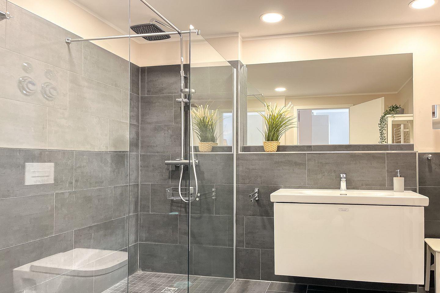 Das Badezimmer ist modern eingerichtet und verfügt über eine bodengleiche Dusche, WC, Waschbecken, Kosmetikspiegel und Haartrockner – ideal für einen erfrischenden Start in den Tag.