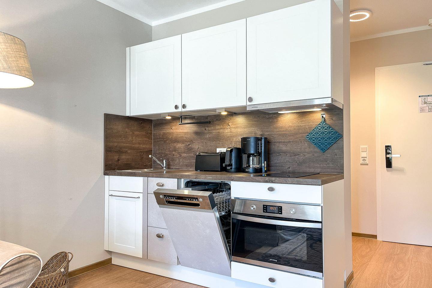 Die moderne Küche ist offen gestaltet und mit allem ausgestattet, was Du für die Selbstverpflegung brauchst: Cerankochfeld, Backofen, Kühlschrank mit Gefrierfach (im Flur), Spülmaschine, Kaffeemaschine, Wasserkocher, Toaster sowie Kochutensilien und Geschirr.