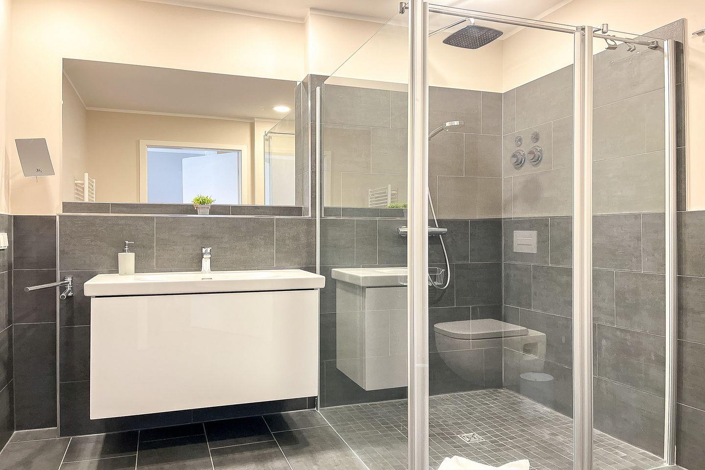 Das Badezimmer ist hochwertig mit einer bodengleichen Dusche, WC, Waschbecken, Kosmetikspiegel und Haartrockner ausgestattet und bietet angenehmen Komfort.