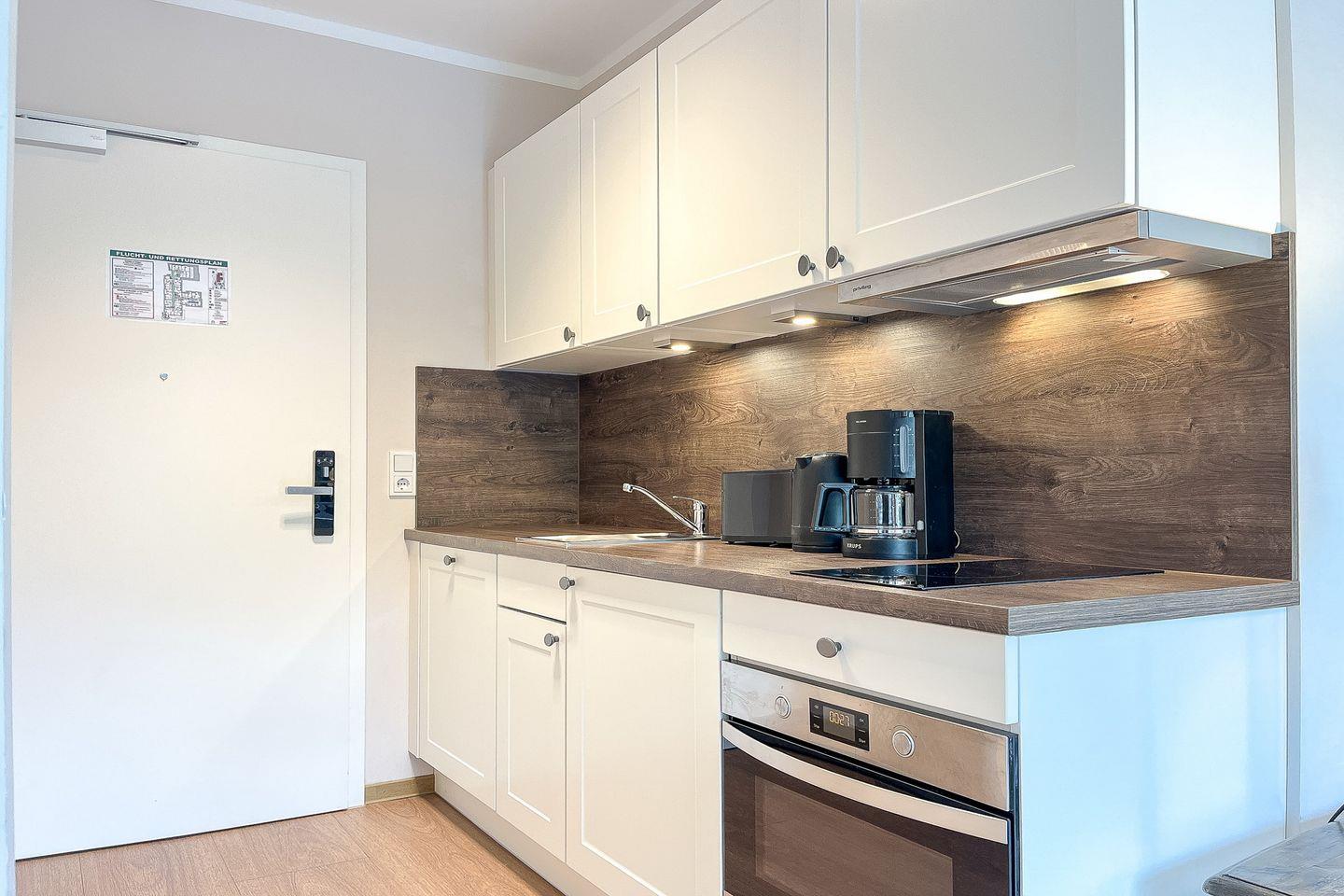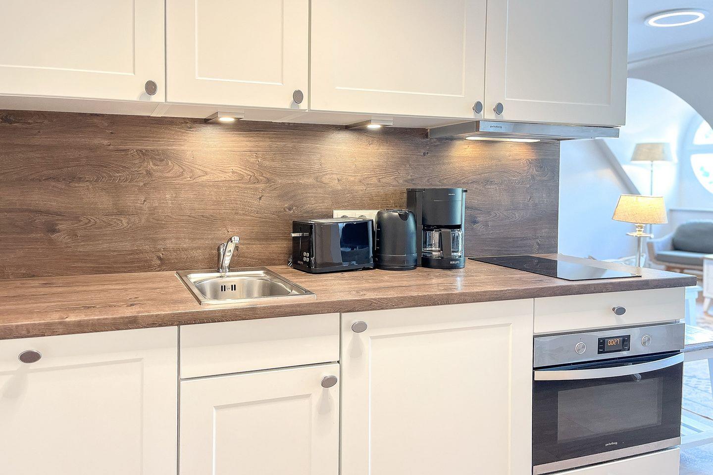 Die offene Küche ist vollständig ausgestattet und lässt keine Wünsche offen: Cerankochfeld, Backofen, Kühlschrank mit Gefrierfach, Spülmaschine, Kaffeemaschine, Toaster, Wasserkocher sowie vielfältige Kochutensilien, Geschirr und Besteck stehen bereit – ideal für Deine Selbstverpflegung.