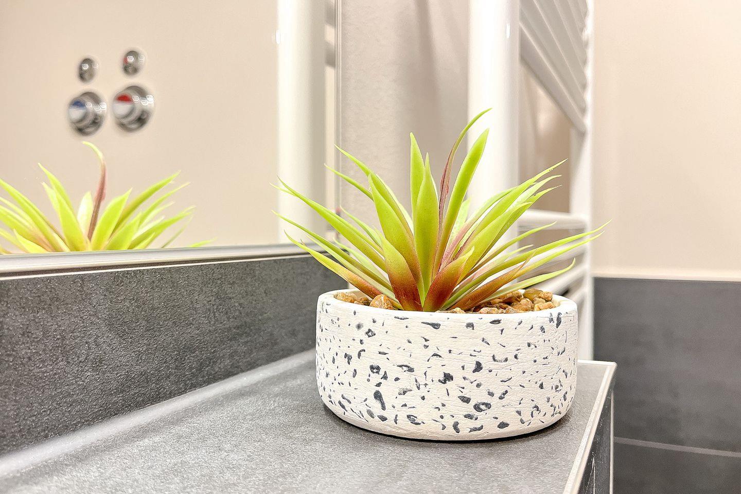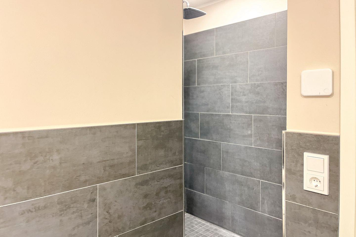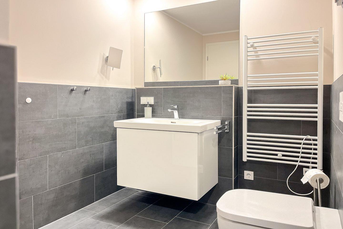 Das moderne Badezimmer verfügt über eine bodengleiche Dusche, WC, Waschbecken, Kosmetikspiegel und Haartrockner – ideal für einen angenehmen Start in den Tag.