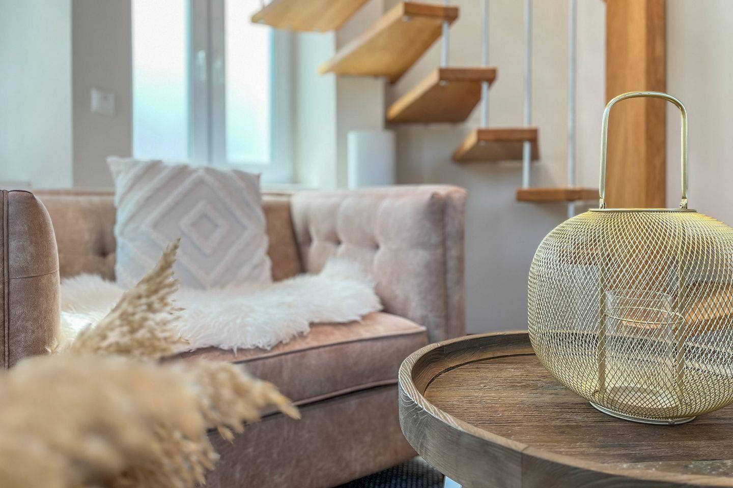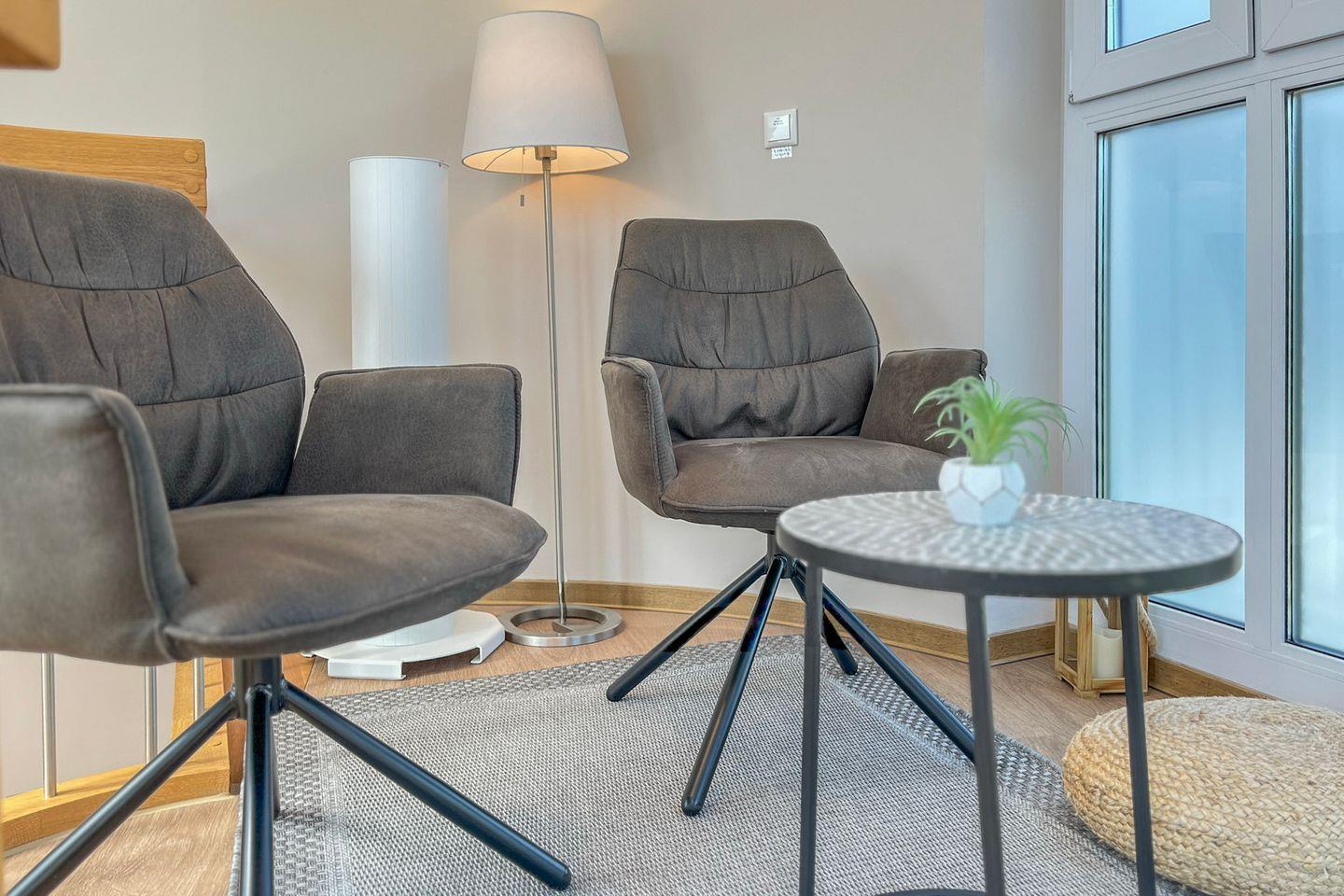 Der großzügige Wohnbereich lädt mit einem bequemen Sofa inkl. Schlaffunktion, Sesseln und einem modernen Flachbild-TV zu gemütlichen Stunden ein. Der angrenzende Essbereich ist harmonisch in das Raumkonzept integriert und bietet ausreichend Platz für gemeinsame Mahlzeiten. Über eine Wendeltreppe gelangst Du ins Turmzimmer.