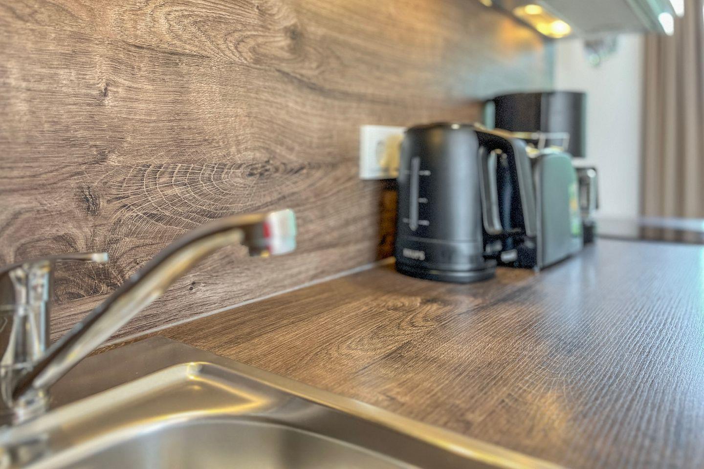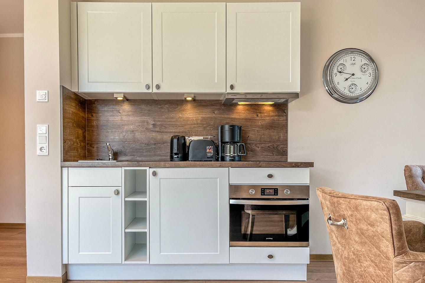 Die offene Küche ist voll ausgestattet und lässt keine Wünsche offen: Cerankochfeld, Backofen, Kühlschrank mit Gefrierfach, Kaffeemaschine, Wasserkocher, Toaster sowie umfangreiche Küchenutensilien und Geschirr stehen Dir zur Verfügung.
