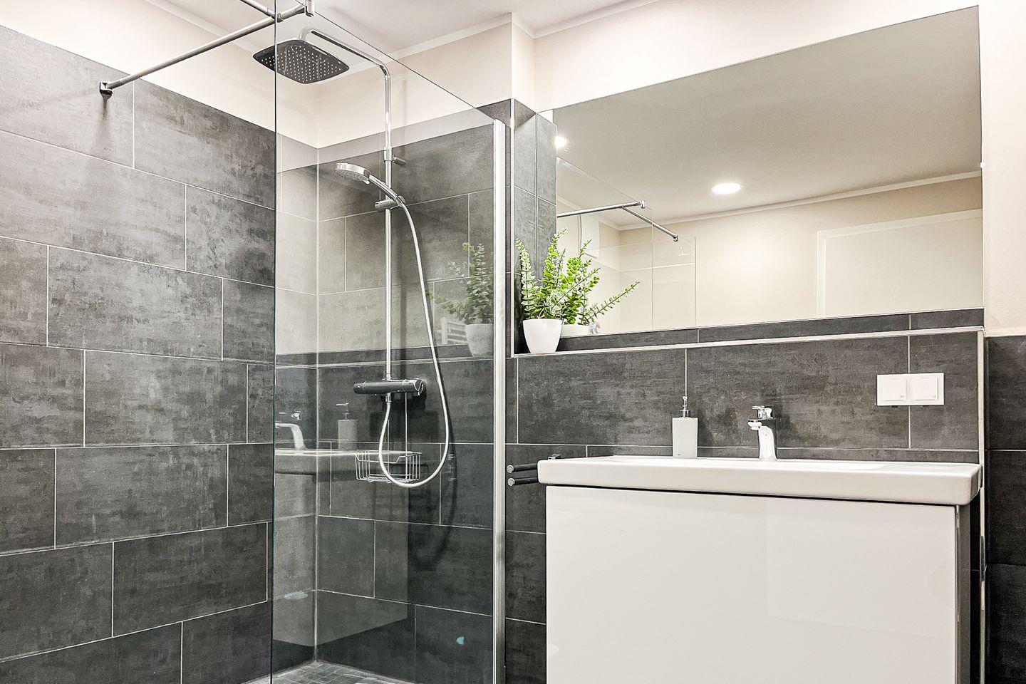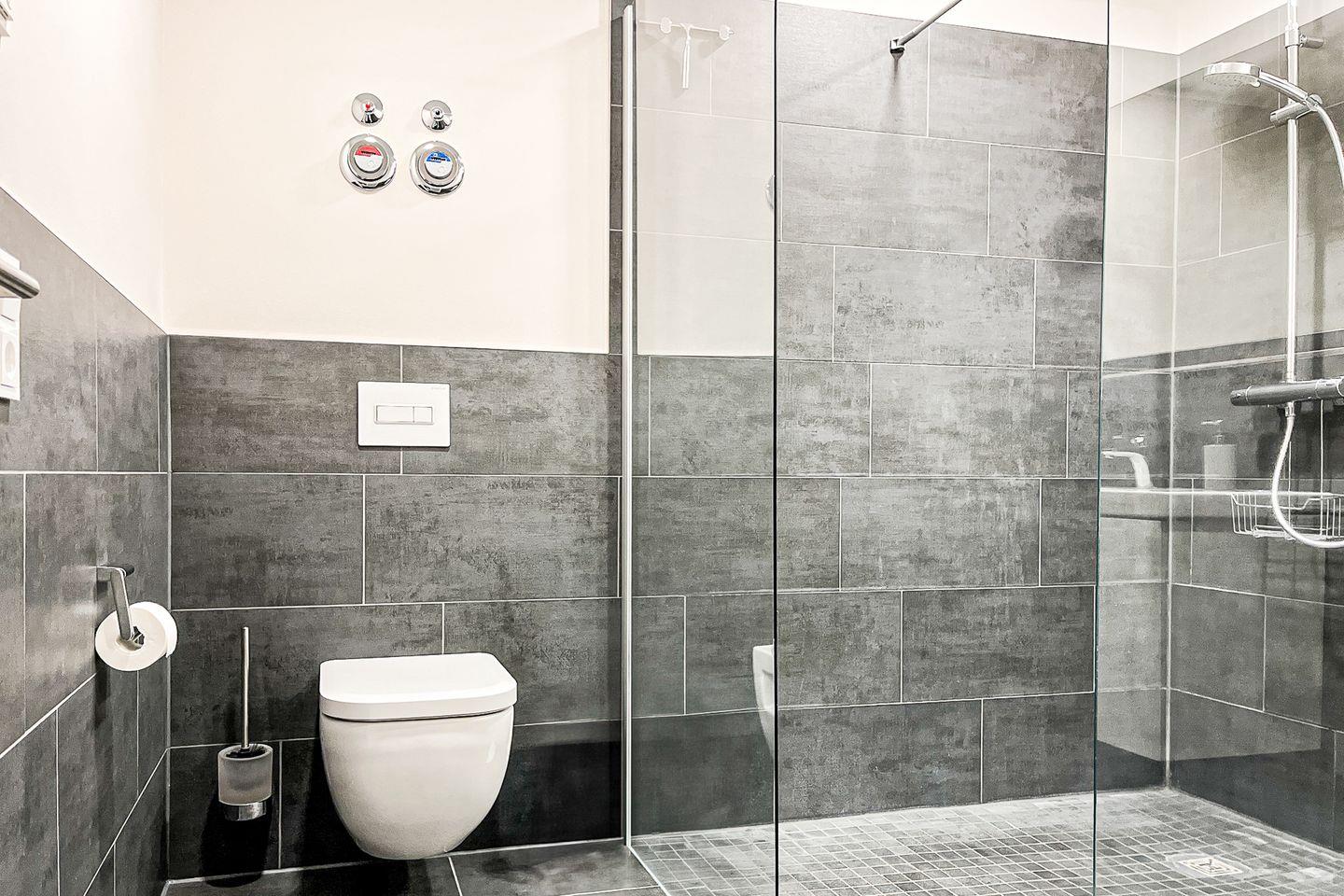 Das Badezimmer ist funktional und modern mit bodengleicher Dusche, WC, Waschbecken, Kosmetikspiegel und Haartrockner ausgestattet.